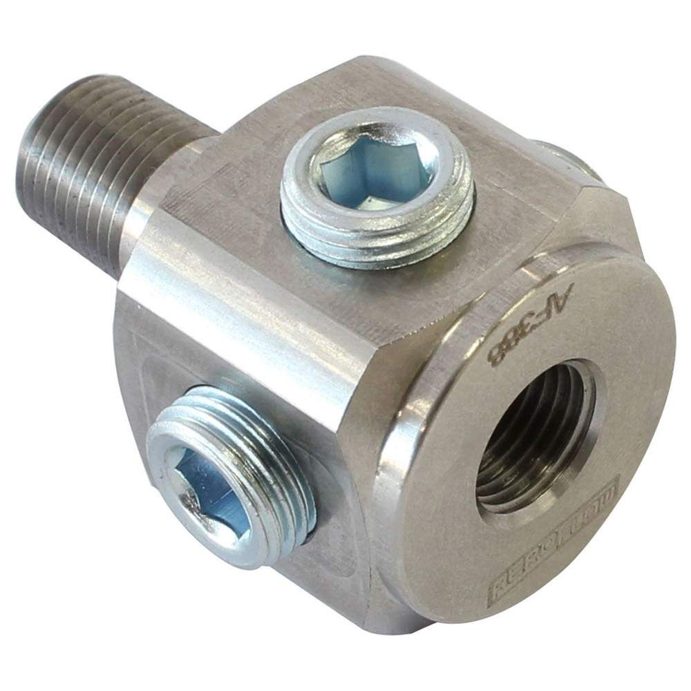 This BSP to NPT block tee adapter from Aeroflow is a universal adapter that can be used with any factory or aftermarket sensors. This willallow you to plumb in multiplesensors or multiple lines fromthe one location on your engine block. This adapter is made from 304 stainless steel and includes 1 male 1/8" BSP male thread with 5 female 1/8" NPT ports. 4 x 1/8" NPT plugs are included so the remaining unused ports can easily be plugged.