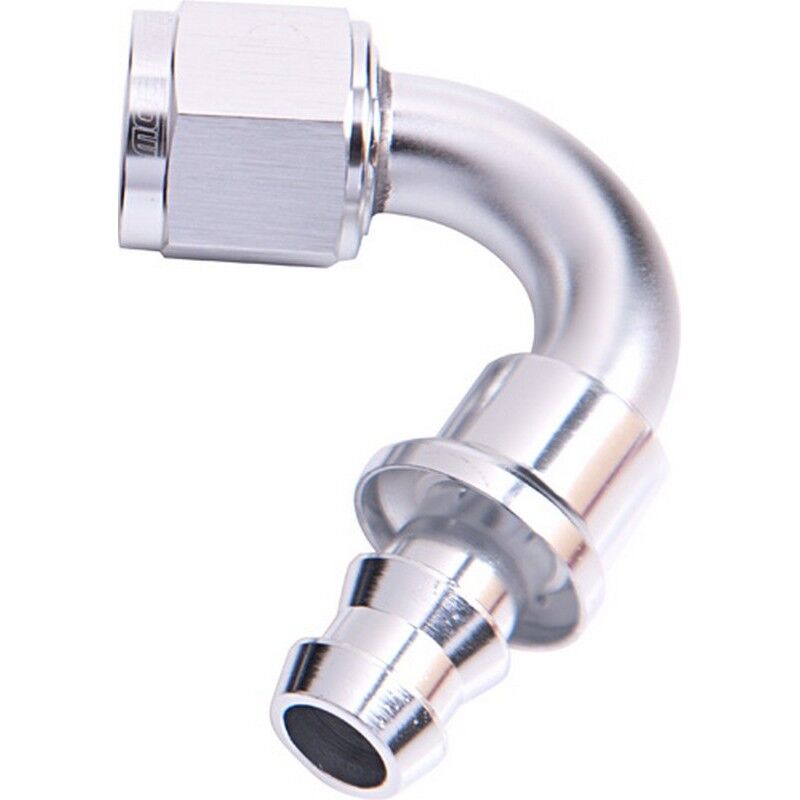 Aeroflow's 400 series push lock fittings are a mandrel bent braised full flow fitting with a custom designed barbed end to allow a quick, easy and leak free assembly. Aeroflow's push lock fittings come with a purpose designed cover to hide the messy cut end of the hose to give you that professional look everytime. Compatible Hose: 400 and 500 Series Push Lock hose (Blue and Black).