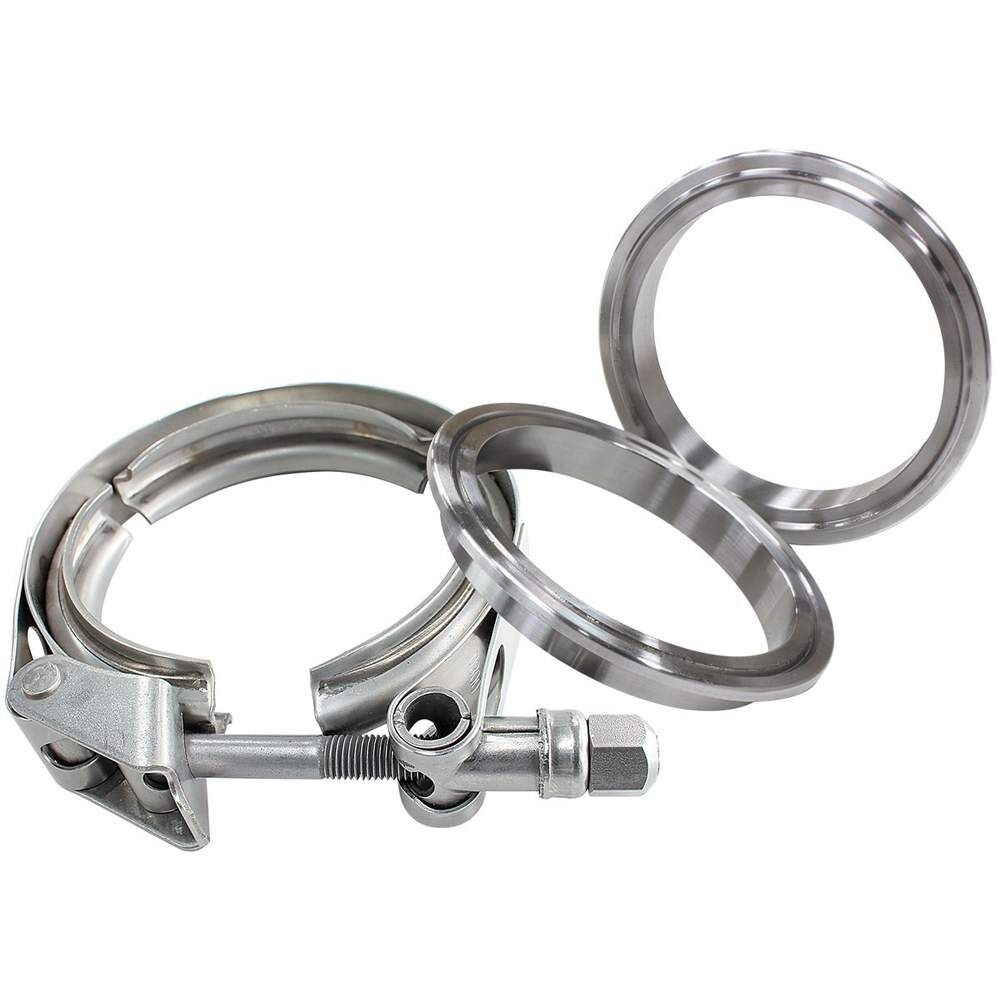 Aeroflow Performance V-Bandkits make it easy to install and remove exhaust systems andturbo parts. The self-aligningV design weld flanges have been designed with a male to female connection which not only helps align the bands butalso provides multiple sealingsurfaces which prevent leaks and warping. These self-aligning V band exhaust clamps are uniquely designed to help keep your exhaust system operating properly and,even more importantly, allow you to disassemble your systemfor service or to repair othersystems on your vehicle.