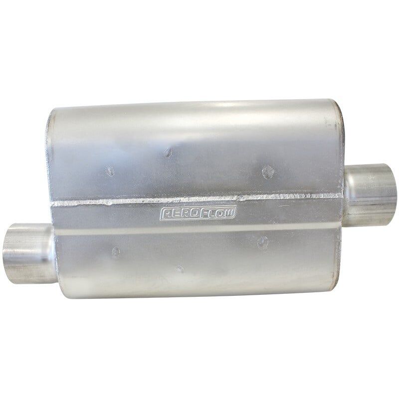 Aeroflow's 5000 series mufflers are the perfect choice for today's street driven high horsepower muscle cars where both flow for maximum performance and decibel reduction are critical. Manufactured from durable 16 gauge TIG welded aluminised steel and coated in a high temp silver finish, Aeroflow's 5000 series mufflers are a chambered design for a consistent sound that won't change over time. When used as part of an appropriate exhaust system they offer a throaty exhaust sound on acceleration and quiet operation at idle and cruising speeds. These mufflers are available in 3 configurations Centre/Centre, Offset/Centre and Offset/Offset with inlet/outlet sizes in both 2-1/2" and 3". Will fit many applications, perfect for the single system or classic muscle car dual exhaust.
