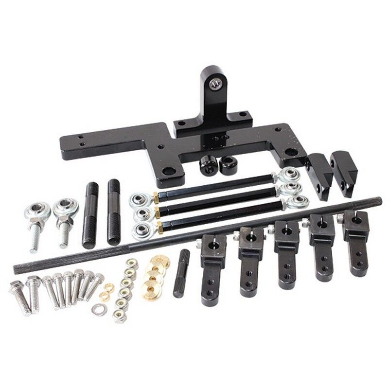 This dual carb linkage kit is designed for use on dual 4150 Series carburettors (non-dominator) mounted sideways on top of a blower. AF42-1070 has high quality chrome elite finish and AF42-1070BLK hand polished black anodised finished. Features adjustable heim end design and needle bearings for longevity and smooth throttle operation. Shafts and arms are splined to avert slipping. Two extra-long studs are included to mount the lower cable bracket to the left side of blower.