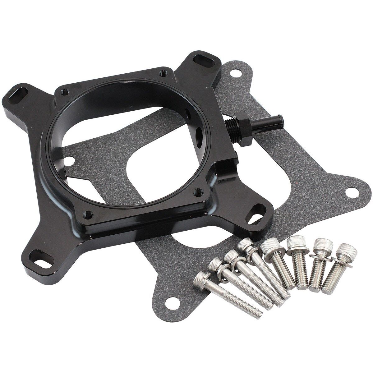 Look to Aeroflow when you are wanting the old school retro look while having the latest up to date technology in your EFI powered ride. This drive by wire flange adapter allows you to bolt on a GM LS 102mm drive by wire throttle body to a 4150 flanged EFI intake manifold. Meaning you will never have to worry about stretching, adjusting, or breaking throttle cables again. This adapter plate is CNC machined from billet aluminium and hard anodised black. The O-Ring design provides an air tight seal between the adapter and throttle body. It features slotted bolt patterns which allows you to clock the throttle body in multiple directions. As well as 2 x 1/8” NPT and 1 x 3/8” NPT vacuum ports are included in the 1” high adapter.