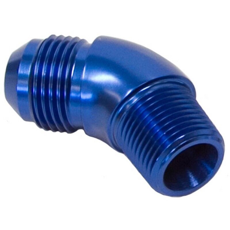 Male to Male full flow NPT to AN adapter. Adapt from and NPT thread to AN flare with a 45 degree bend. The full flow design ensures no restriction in flow from matched hose sizes. Various sizes available.
