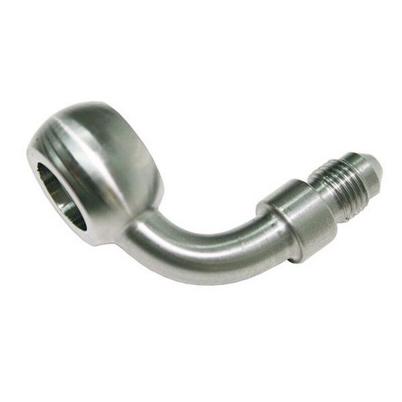 90 degree Banjos are sold to suit either -3 or -4 to suit 200 series PTFE hose and with size including  3/8"(10mm), 7/16 (11.2mm) and 12mm.