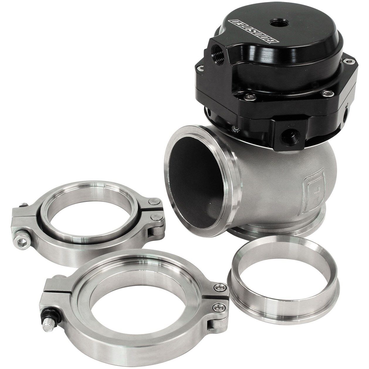 Aeroflow wastegates feature water cooling ports ( 2 x M8 x 1.0mm ) for those heavy duty applications. These are optional use and can be disregarded if not required. There are also 3 lower air pressure ports and two top air pressure ports ( 5 x M10 x 1.00mm ) for easy installation this eliminates the need to rotate the actuator top, plugs are included for unused ports. Aeroflow's wastegates come preset at 1 bar. This can easily be altered by purchasing and installing springs from Aeroflow's accessory range. The wastegate also includes required stainless steel hardware for installation including: valve seat, inlet V-band clamp/flange and outlet V-Band Clamp/flange.