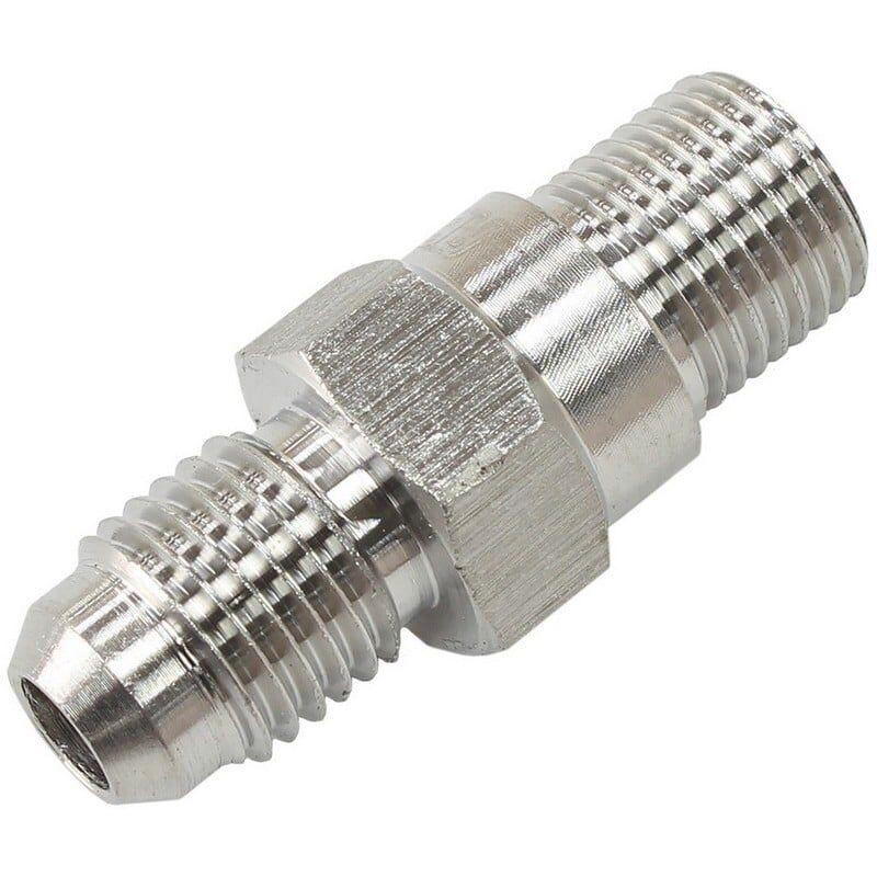 This oil feed fitting is designed to suit turbo chargers that have a 7/16-24 oil inlet. Stainless steel construction, the inlet fitting has a -4 AN and it also features an internal oil restrictor (0.90mm) which is perfect for any Boosted Turbocharger with a ball bearing core.