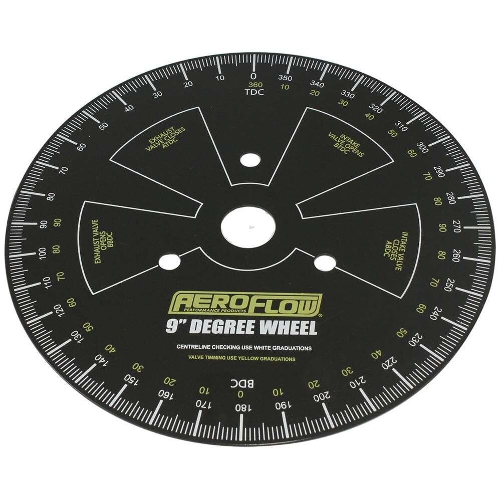 The Aeroflow Performance degree wheels are a mandatory tool for the professional engine builder to keep in the workshop. It accurately measures several timing functions of an engine such as valve timing, top dead center, bottom dead center etc. Made from heavy gauge metal with a silk screen finish for long-lasting use in shop or track environments. Available in the smaller 9” diameter or the larger 18” diameter.