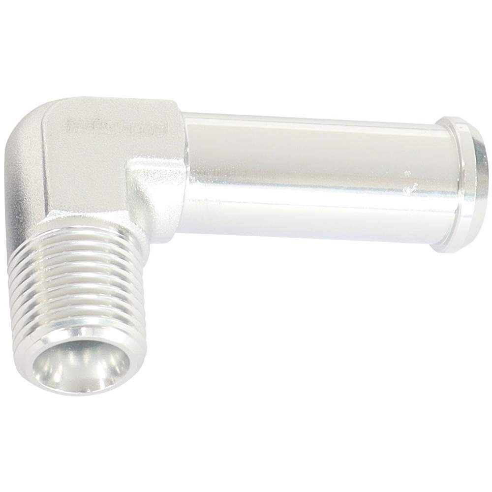 These handy NPT to 90 degree hose barb fittings are designed to allow easy fuel line installation on electric fuel pumps and regulators whenusing rubber fuel line. They have a male NPT fitting on oneend and a barbed fitting on the other end and they're available in different sizes to fit your needs.These barb sizes are designed to work with Aeroflow 400 series and 500 series Push Lock Rubber hose. Available in various sizes with Blue, Black and Silver finishes.