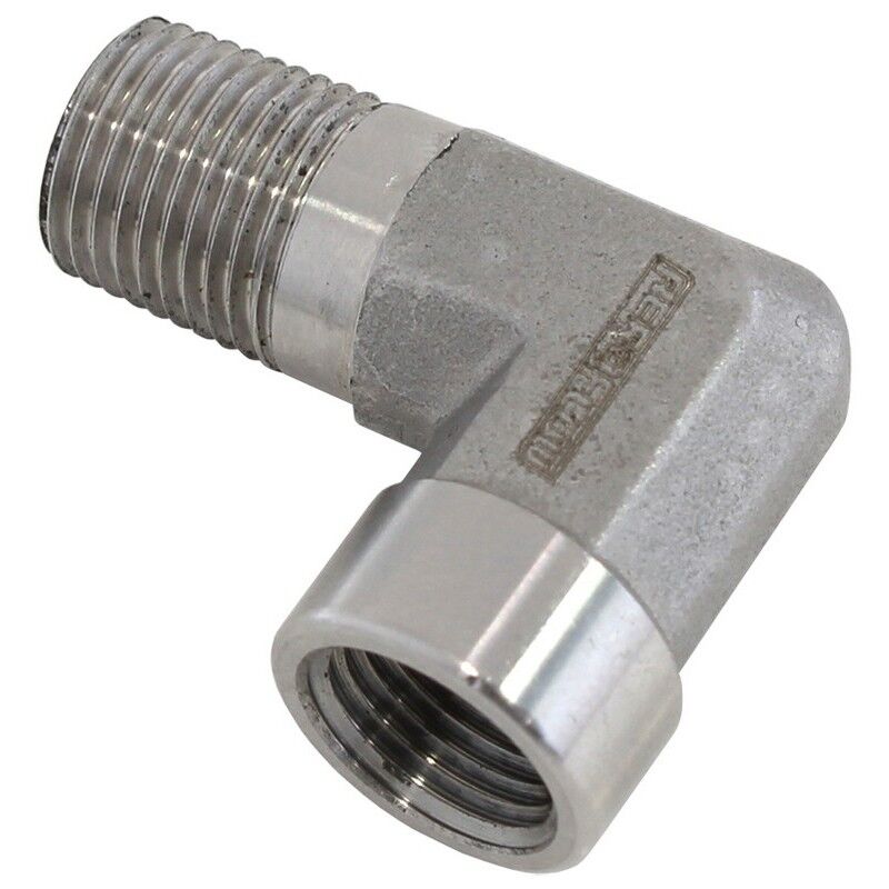 90 degree Stainless steel adapter with Female to Male 1/8" NPT thread.