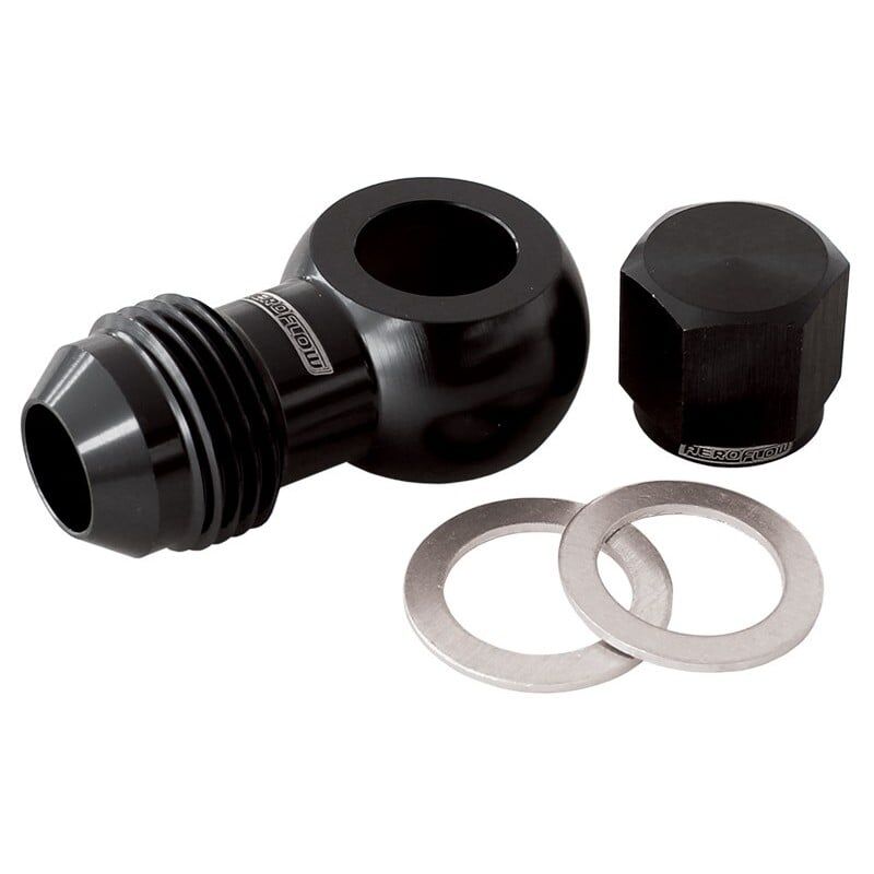 This banjo kit from Aeroflow offers a great cost-effective solution when fitting a Aeroflow 49-1014 or Bosch 044 style of fuel pump to your vehicle. It retains the one-way check valve that is included when you purchase this fuel pump brand new. It will allow you to run either a AN or hose barb from the inlet of the fuel pump at 90 degrees. This is a great way for those tight spaces or under car installations. Manufactured from 6061-T6 billet aluminium and available in blue, black and silver anodised finishes. Each banjo kit comes complete with banjo, cap end and washers.