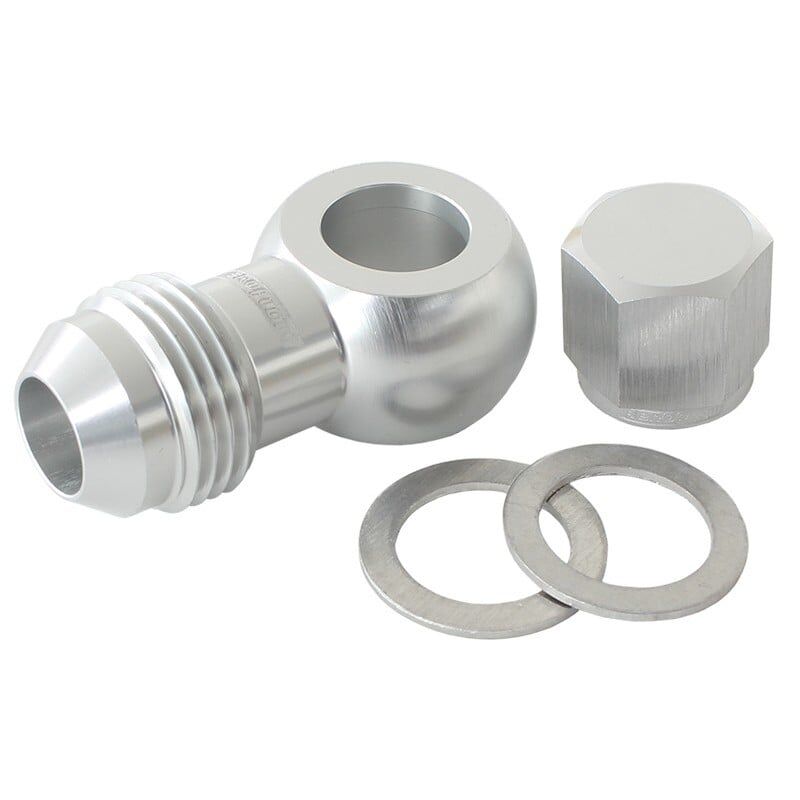 This banjo kit from Aeroflow offers a great cost-effective solution when fitting a Aeroflow 49-1014 or Bosch 044 style of fuel pump to your vehicle. It retains the one-way check valve that is included when you purchase this fuel pump brand new. It will allow you to run either a AN or hose barb from the inlet of the fuel pump at 90 degrees. This is a great way for those tight spaces or under car installations. Manufactured from 6061-T6 billet aluminium and available in blue, black and silver anodised finishes. Each banjo kit comes complete with banjo, cap end and washers.