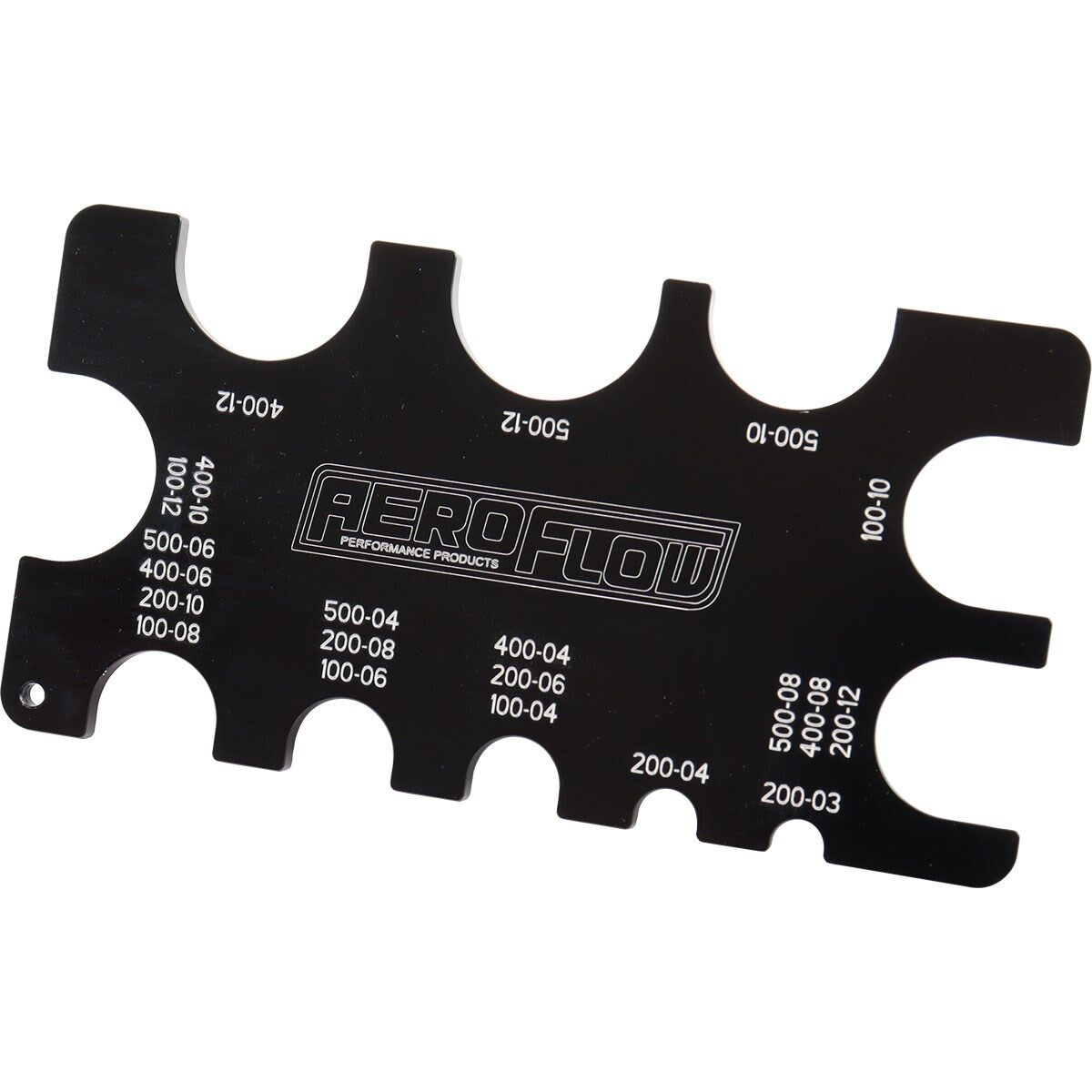 Aeroflow Performance make this handy workshop or home garage tool that allows you to identify which braided or rubber hose you have. This can be used for existing replacement hoses or when new hoses are required for custom application. This makes it easy to order the right hose the first time around. Made from aluminium with deep laser markings for ease of reading and long last durability. Each tool shows both 100/450, 200/250, 400/500 series Aeroflow hose from -3AN up to -20AN.