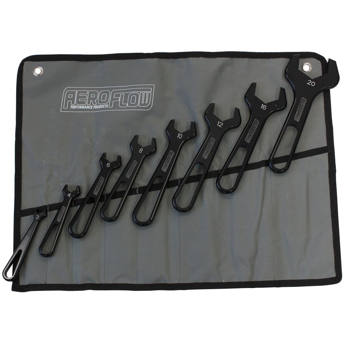 The Aeroflow Pro AN Spanner / Wrench is perfect for all hose end assemblies and adapter fittings, providing a perfect fit so they won't mark your fittings. They are slimline enough to get into all corners of tight spacers.  All aluminium spanners are hard anodized black and size stamped. Being a single ended spanner set they will fit designed to suit B nuts of AN fittings, including 8 sizes from -3AN to -20AN in a 8 piece kit. Recommended to also use in conjunction with the Aeroflow Performance adjustable spanners or vice jaws to install braided hose to fittings. Available in a complete kit with a Pro Spanner roll up bag for protection included or each Pro AN spanner is sold separately as well.