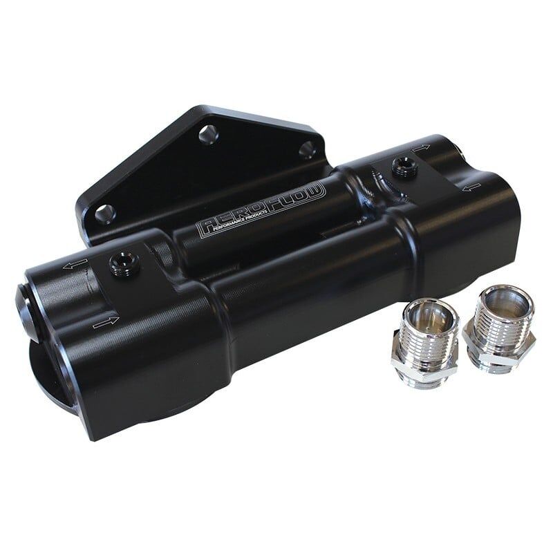 Move your oil filter and add a second oil filter to a new location with Aeroflow Performance universal Dual Billet Remote Oil Filter head with dual side entry. This is great for mounting engine oil filters away from your engine,to make oil filter changes easier or where space is limited in the engine bay. This is great for users that wish to run two oil filters side by side for extra protection and filtration. Side Entry on both sides labelled inlet and outlet -8ANORB ports are provided for plumbing the engine oil to andfrom the oil filter remote mount. The main body is made from billet 6061 aluminium, then anodised black for great looks and corrosion resistance. Integrated one piece bracket which can be used to make installation easier in various universal applications.