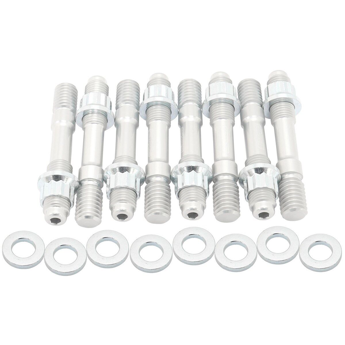 Blower stud kits are machined from aerospace-quality 6061-T6 aluminium and are black or silver anodized. In the event of a severe backfire, these studs will break and allow separation of manifold and blower. This protects engine and blower from unnecessary damage. Kit comes complete with anodized aluminium studs,12-point, quality steel nuts and hardened steel washers.