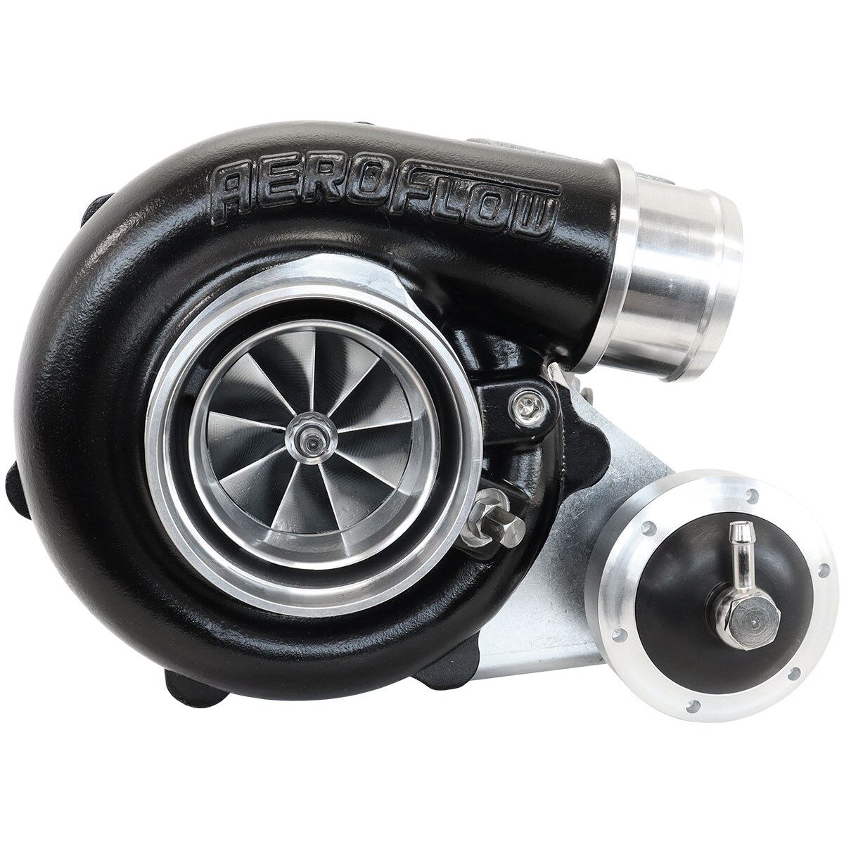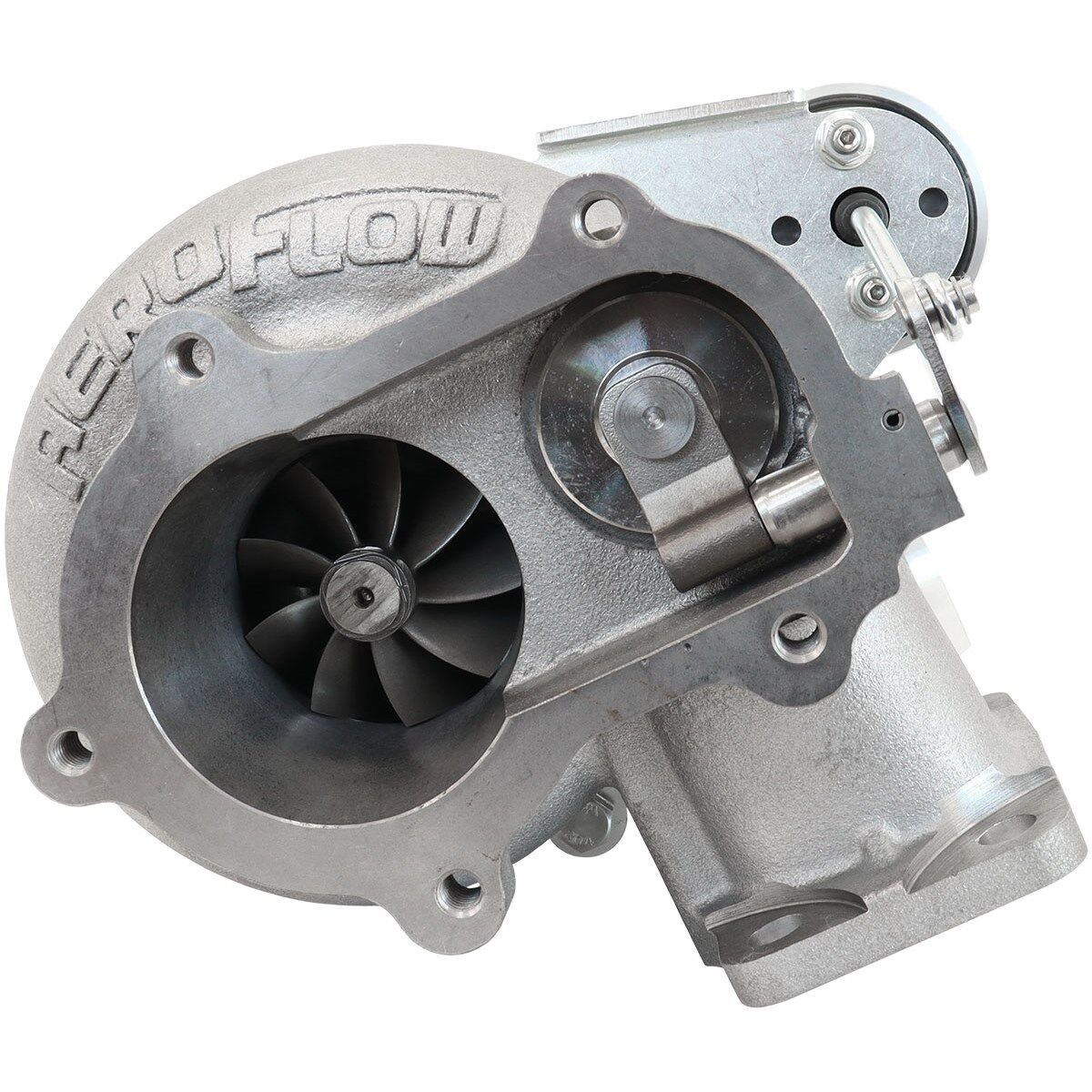 In addition to our current range of Boosted B5455 turbochargers. We have this internal wastegate option with a T3 .82 rear housing. This turbo is designed as a good bolt on upgrade option for Nissan Skyline, Holden VL with standard low mount turbo manifold. The internal wastegate rear housing is 20mmlonger above the T3 flange mounting plate to help clear the factory manifold. It features a Ford XR6 5 bolt dump pipe flange which pairs well with the Aeroflow Performance Ford XR6 to V-Band Adapter to convert the 5-bolt flange to a 3” V-Band to help to fabricate a new exhaust.< br/>This turbo is great for smaller engine displacements from 2L up to 3.5L with the B5455 rated up to 660 engine horsepower. < br/>The Boosted B5455 utilizes a Point Milled Billet compressor wheel which is manufactured from 7075 aluminium. Not only is the billet wheel upgraded from the old days of cast wheels but if you look closely at the finish of the compressor blades you will notice the point milling. Most turbochargers have a smooth surface finish known as flank milling. This is where blade surfaces are milled in a single pass on the CNC machine. This is economical and saves time but performance wise is lacking compared to point milling. Point milling brings the CNC tool over the compressor blade using multiple passes. This is a complicated process which increases the machining time and cost. The Point milled wheel provides increased flow (cfm) and reduces exducer tip speed allowing the turbo to spool faster, resulting in a much more efficient turbocharger. This point milling can increase flow (cfm) up to 15-35% depending on each size compressor wheel.< br/>The 9-blade turbine wheel is constructed from Inconel, a Super Alloy that maintains strength during prolonged exposure to extremely high exhaust gas temperatures. When comparing this to the first generation 5455 which has a 10-blade turbine wheel. By dropping just one blade from this turbine wheel you can see some great results in top end power. Combine this with a smaller diameter center shaft that reduces the weight. You end up with a less restrictive flow of exhaust gasses allowed to exit out the rear housing at a more efficient rate.< br/>Each B5455 turbocharger is a dual ceramic ball bearing cartridge designed to prolong the turbo lifespan and improve shaft balance. Our ball bearing design reduces the required amount of oil to provide adequate lubrication. This lower oil volume reduces the chance for seal leakage. Also, the ball bearing is more tolerant of marginal lube conditions, and diminishes the possibility of turbocharger failure on engine shut down. Boosted ceramic ball bearings are sourced from Germany or Japan depending on model. Our ball bearing cartridge utilizes an external restrictor, included with each turbocharger is a turbo oil feed fitting which has an 1mm restrictor inside the fitting.< br/>You will notice that we have two water ports on each side of the turbochargers core. This is great for installing water lines in compact areas and gives a better option for plumbing. Water cooling improves mechanical durability and lengthens the turbocharger's life. Water cooling's main benefit actually occurs after the engine has been shut down. Heat stored in the turbine housing and exhaust manifold "soaks back" into the center section of the turbocharger after shutdown.< br/>Aeroflow Performance Boosted turbochargers are designed specifically for the enthusiast who wants optimal performance at a competitive price. Boosted Turbochargers have a range of specific turbos to meet your power goals, driving style and budget. Boosted turbocharger's utilise billet compressor wheels and feature the latest aerodynamic design that maximises horsepower and boost response throughout the rev range. The turbine wheel is constructed from Inconel, a Super Alloy that maintains strength during prolonged exposure to extremely high exhaust gas temperatures.< br/>Boosted Turbocharger's are available in 360 DEGREE journal bearing, dual and triple ceramic ball bearing cartridges designed to prolong the turbo lifespan and improve shaft balance. Boosted Turbocharger's are also available in oil/water or oil cooled versions to help keep temperatures to a minimum. The boosted range of turbos are available with a ported shroud compressor cover housing which increases surge resistance and provides reliable, continuous power throughout the engine's RPM. Boosted turbochargers are available for a direct bolt-on for some Ford's and Nissan's with further models in development. Boosted turbos are available in natural aluminium or high temp black compressor cover options.