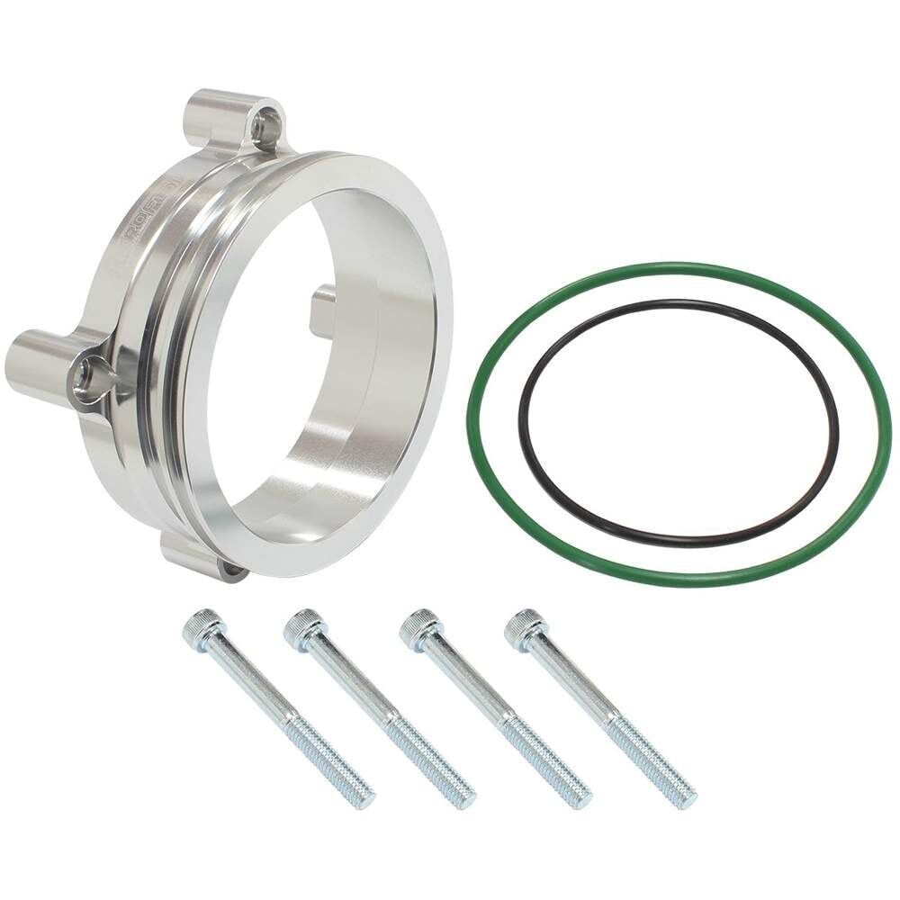 These handy adapters bolt to front of the popular Bosch 74mm and 82mm Electronic Throttle Body (AF64-2135, AF64-2136) and allows an Aeroflow intercooler clamp (AF25-3000 and AF25-3500 sold separately) to be used. The internal bore of the adapter has been designed to ensure a smooth transition to the throttle body for maximum flow. Featuring an O-ring on each side of the adapter to ensure a positive seal onto the throttle body and the intercooler clamp. Machined from billet 6061-T6 aluminium and anodized in a Black or Silver finish.