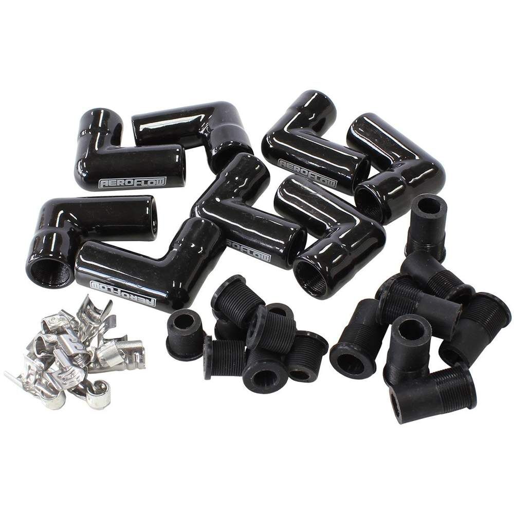 Aeroflow Performance ceramic spark plug boots and terminals have been developed to address the problems associated with burnt spark plug boots. Whether you're running headers with close tolerances, a turbo manifold and dump pipe with very littleroom in the engine bay for heat shields or you're just over melting your spark plug boots from extreme heat. Theseblack ceramic wire boots are the answer! They can withstandtemperatures of up to 1090°C (2000°F). You can match these with our XPRO ignition lead wire that is 8.5mm spiral wound low resistance with high EMI suppression which is sold separately in different lengths along with spark plug boots to completely custom make your new set of leads or just re-crimp your current lead sets to upgrade them.