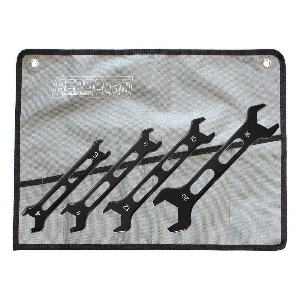 The Aeroflow Pro AN Spanner / Wrench is perfect for all hose end assemblies and adapter fittings, providing a perfect fit so they won't mark your fittings. They are slimline enough to get into all corners of tight spacers.  All aluminium spanners are hard anodized black and size stamped. Being a double ended spanner set they will fit designed to suit B nuts of AN fittings, including 7 sizes from -3AN to -20AN in this 4 piece kit. Recommended to also use in conjunction with the Aeroflow Performance adjustable spanners or vice jaws to install braided hose to fittings. Available in a complete kit with a Pro Spanner roll up bag for protection included or each Pro AN spanner is sold separately as well.