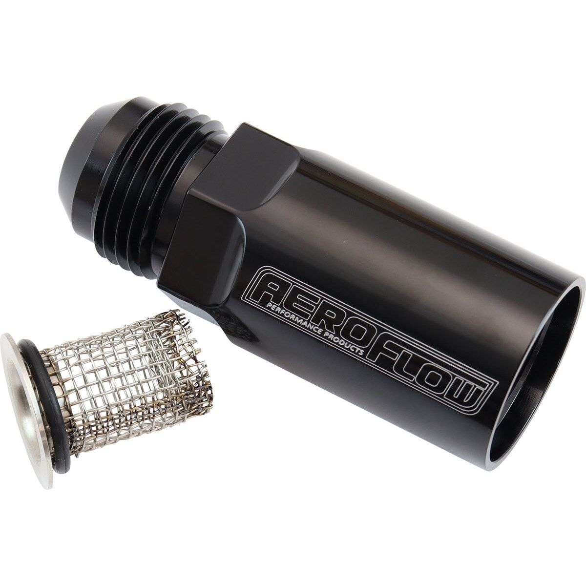 Aeroflow offer two different filters styles to choose from. The 90-degree mounts directly to the oil pan outlet and then has a 90-degree bent tube so that it runs in line with the pan. The straight pan mount screws directly onto a -12AN fitting on the oil pan.