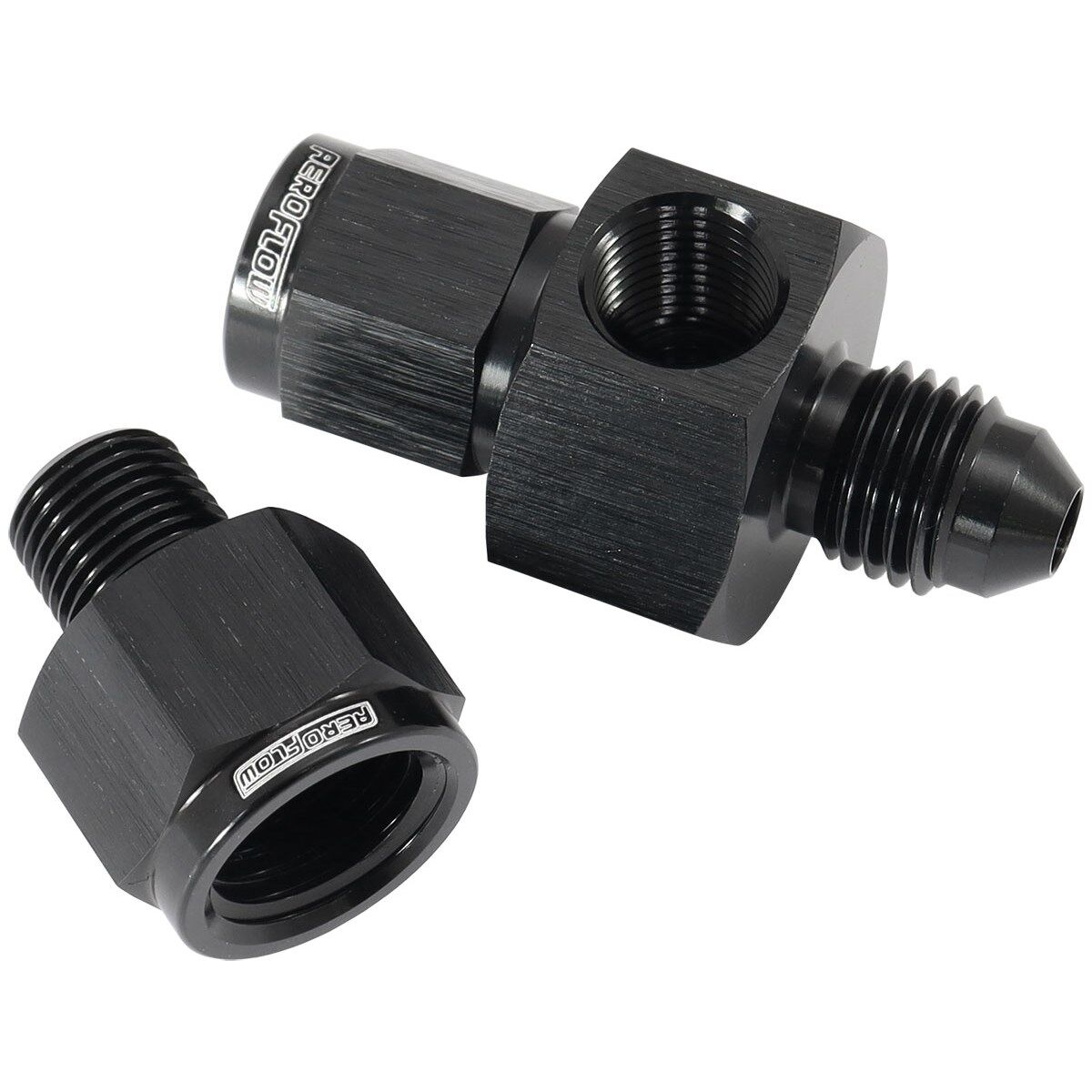 This fitting is designed toadapt the Ford Territory turboengine stock oil pressure sensor when using the Aeroflowbraided line and filter kit. This adapter will also suit most aftermarket line kits. Itfeatures a male to female -4ANwith a 1/8" NPT port in the centre. This 1/8" NPTwill also suit a aftermarket transducer if you wish to use this or a 1/8" NPT expander to 1/4" NPT female is included to suit thefactory oil pressure sensor.