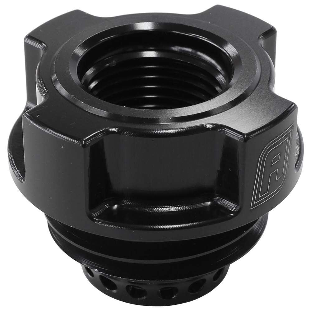 This handy oil fill cap breather by Aeroflow Performance is the easiest wayto add an aftermarket catch tank to the Ford 4.0L 'Barra' 6 cyliner engine without the need to modify the OEM valve cover. These late model valve cover fill caps screw into thevalve cover like an ordinary cap. They feature an internal baffle inside the cap which helps to reduce transfer of oil to catch can. A -10 ORB islocated in the centre for custom plumbing to the catch can or PCV. Billet aluminium construction with a black anodized finish.