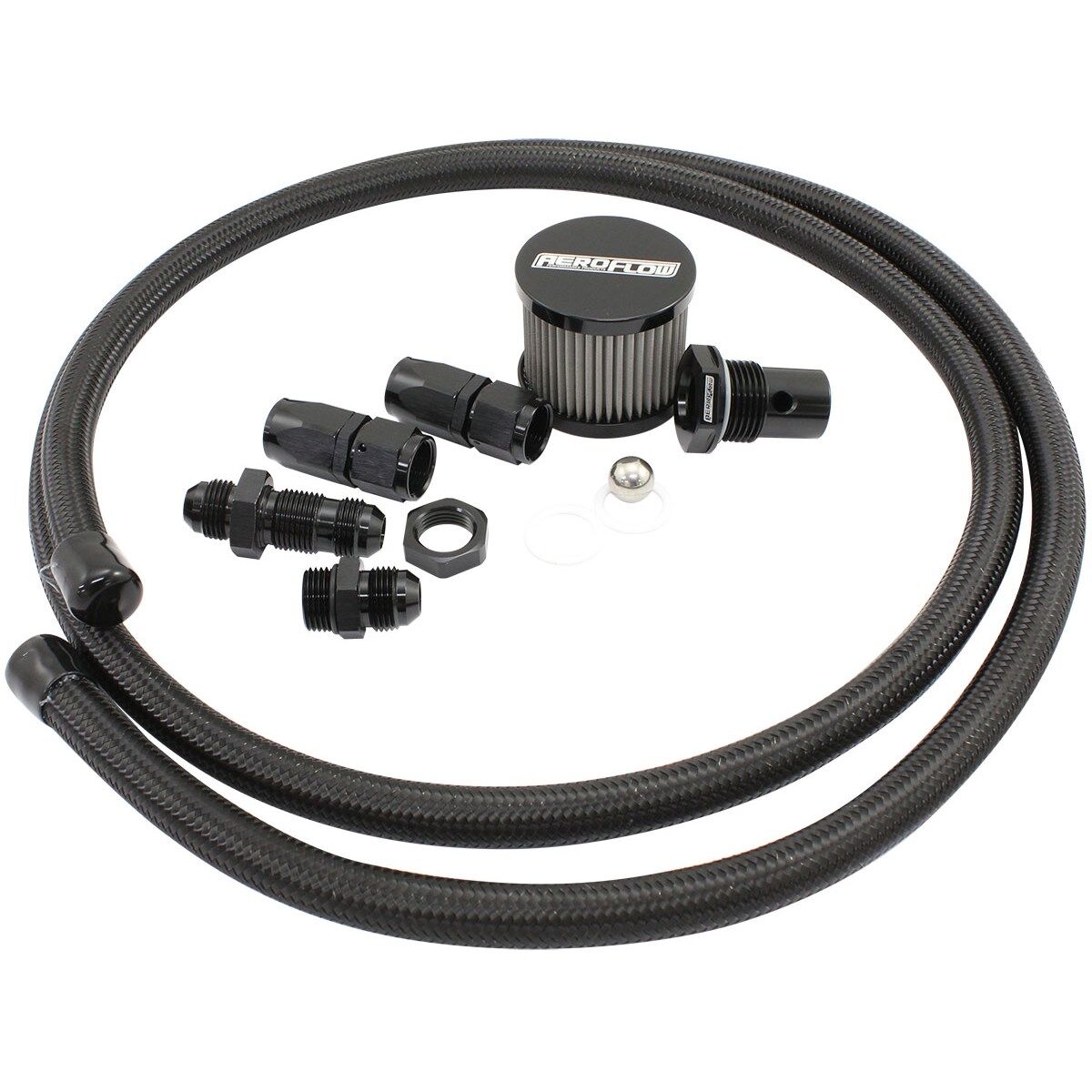 Aeroflow Performance takes the guess work out of plumbing up a fuel cell breather/roll over with this universal kit. Designed to suit the Aeroflow range of fuel cells or any aftermarket fuel cell with a female -12ORB fitting in the fuel cell. This breather setup is vital when installing a fuel cell into your vehicle. It allows air to escape as the fuel cell is filled and permits filtered air to enter when fuel is getting consumed. This allows the tank to breath to avoid pressurization during normal operation.