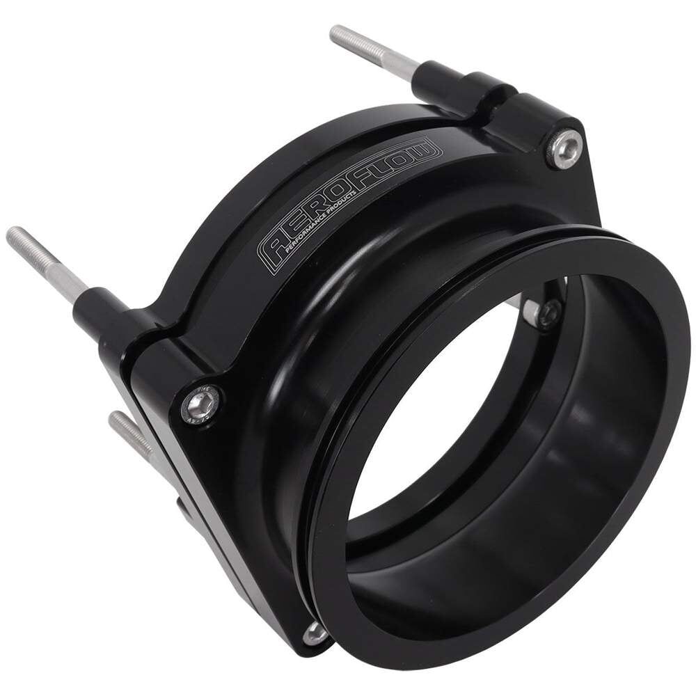 This handy two-piece adapter bolts to front of the Aeroflow Performance GM LS 102mm fly by wire throttle body (AF64-2134/AF64-2134BLK) and allows a 4" Aeroflow intercooler clamp (sold separately) to be used. The internal bore of the adapter has been designed to ensure a smooth transition to the throttle body for maximum flow. Machined from billet 6061-T6 aluminium and anodizedin a silver finish. Includes all bolts and O-rings for installation and a complete positive seal.