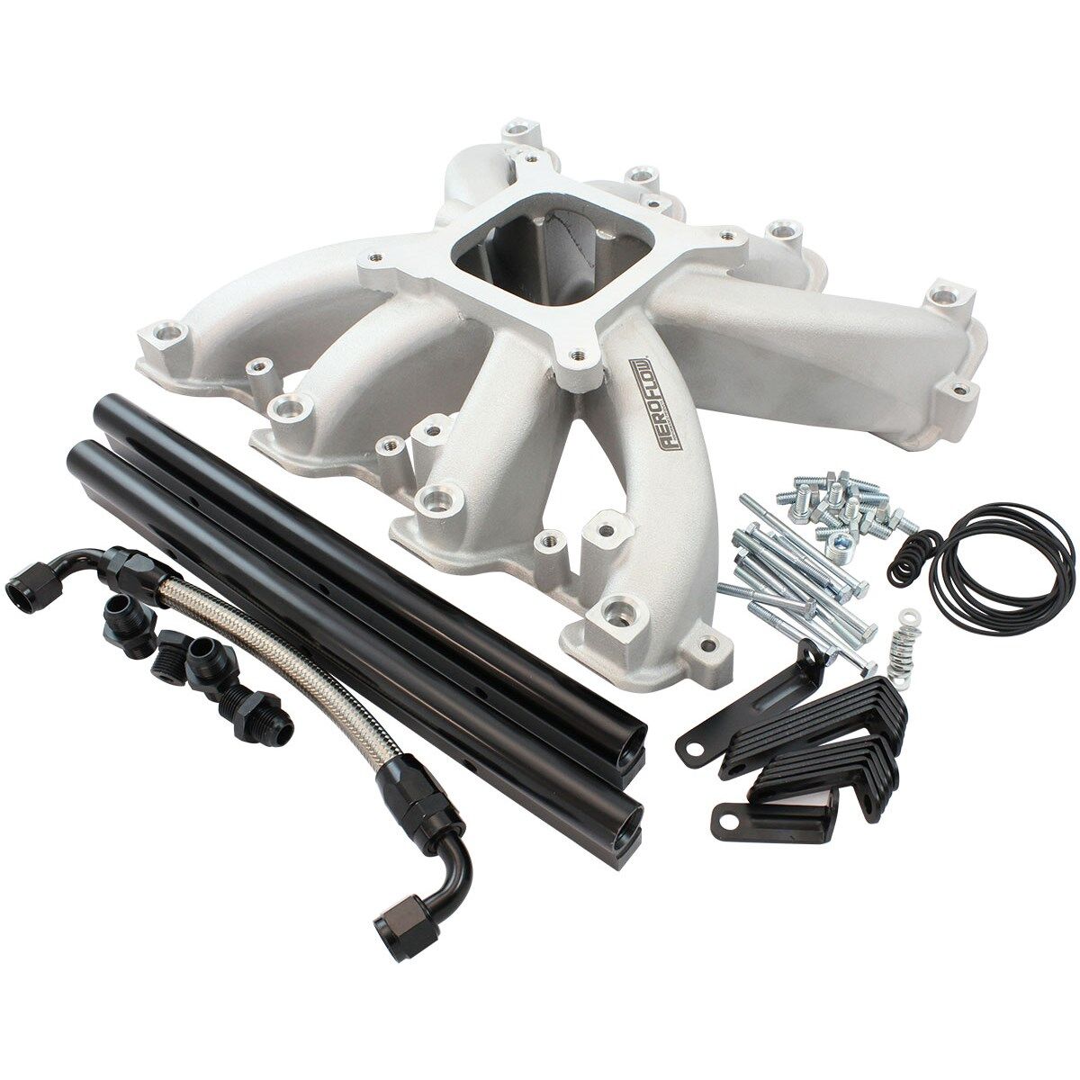 • This intake manifold does not work with factory OEM fuel rails and requires the use of Aeroflow Fuel Rail Kit included (AF6999-5000).