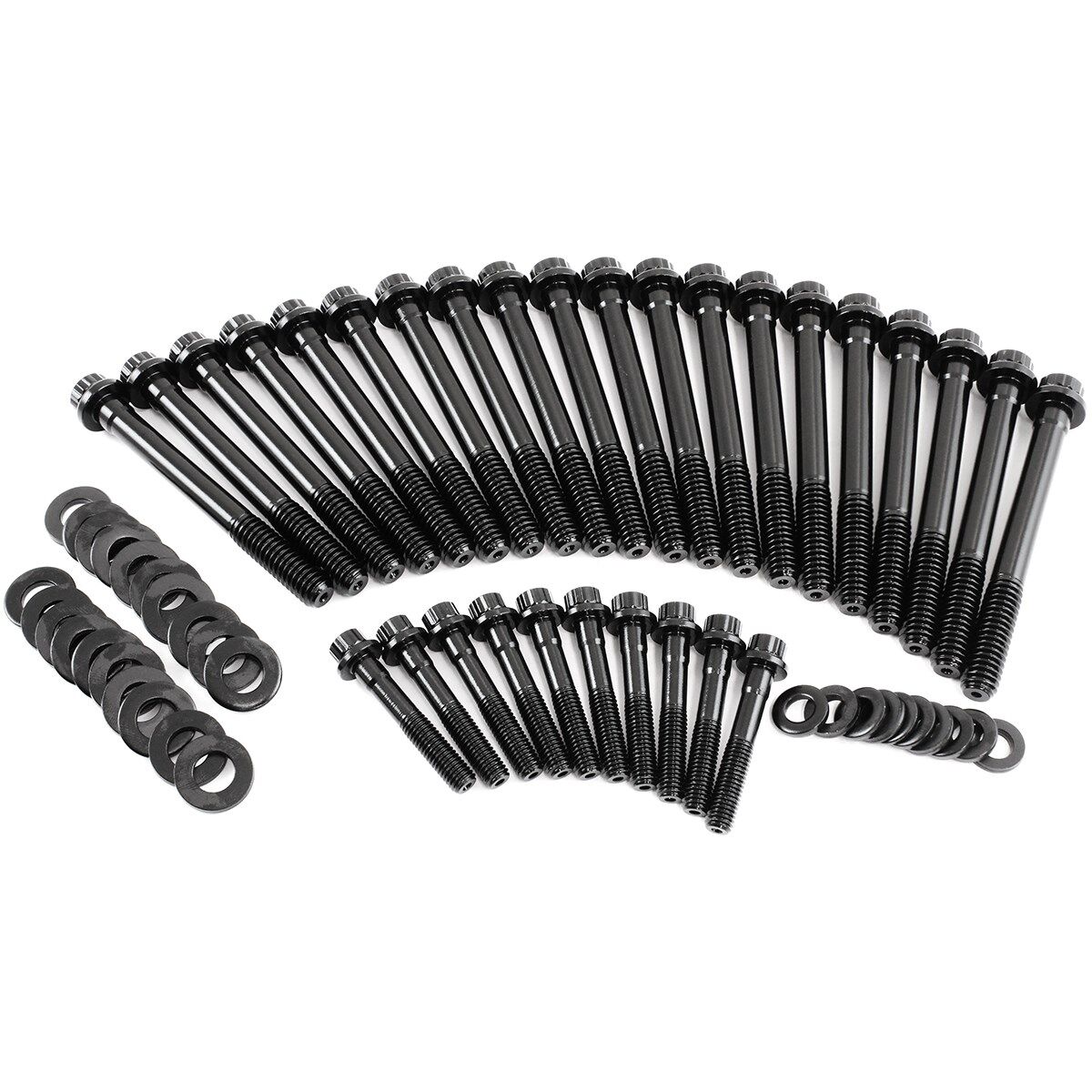 These head bolts are manufactured from aircraft quality 8740 high tensile strength chromolysteel and cold-forged to ensure molecular integrity within the bolt. Meaning thesebolts are rated up to 190,000 psi making them stronger than Grade 8 and OEM fasteners. Allkits come complete with hardened parallel washers for an even load distribution and accurate torque readings.