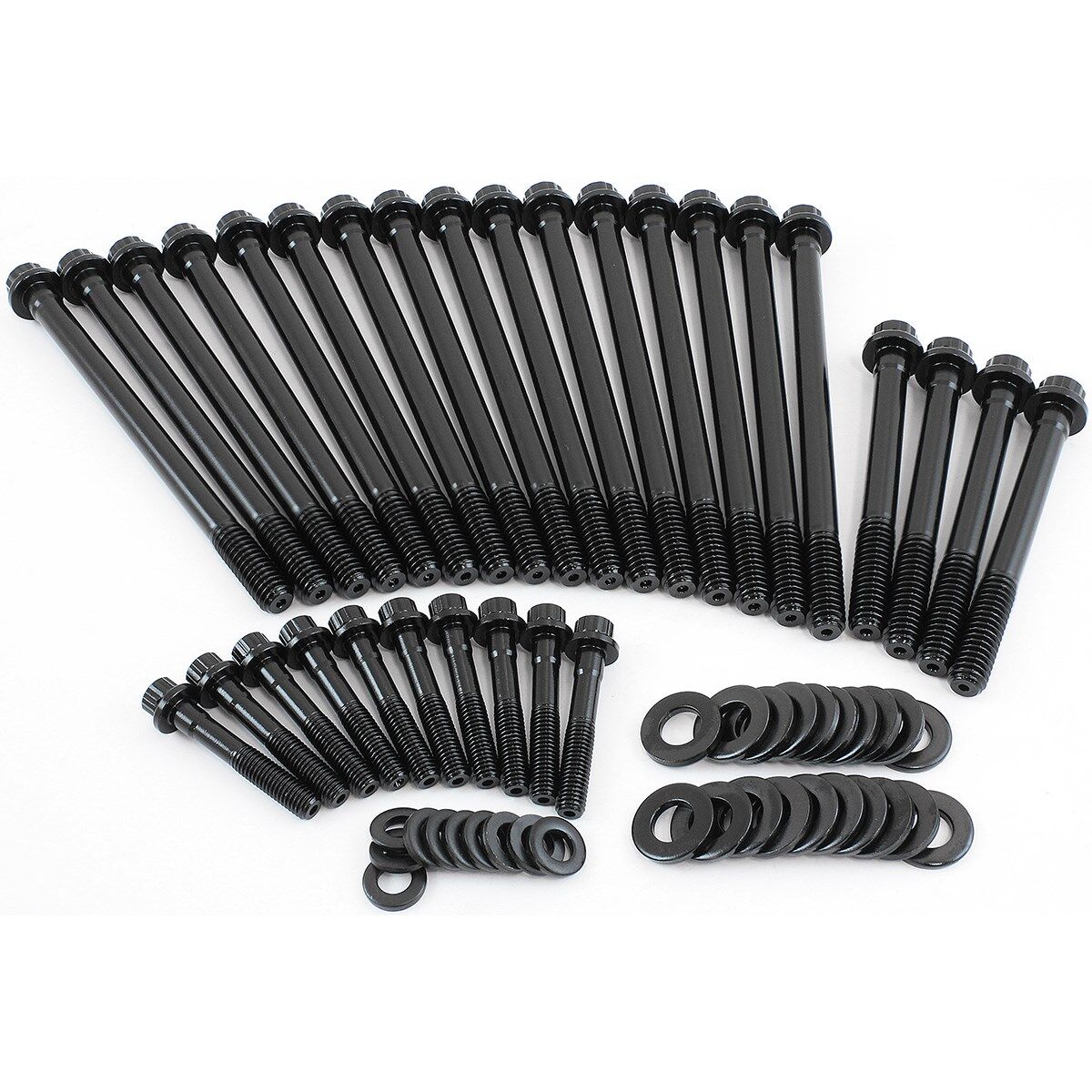These head bolts are manufactured from aircraft quality 8740 high tensile strength chromolysteel and cold-forged to ensure molecular integrity within the bolt. Meaning thesebolts are rated up to 190,000 psi making them stronger than Grade 8 and OEM fasteners. Allkits come complete with hardened parallel washers for an even load distribution and accurate torque readings.