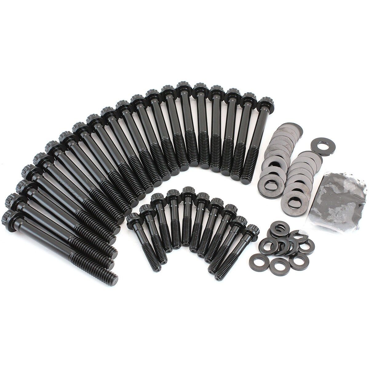 These head bolts are manufactured from aircraft quality 8740 high tensile strength chrome moly steel and cold-forged to ensure molecular integrity within the bolt. Meaning these bolts are rated up to 190,000 psi making them stronger than Grade 8 and OEM fasteners. All kits come complete with hardened washers for an even load distribution and accurate torque readings.