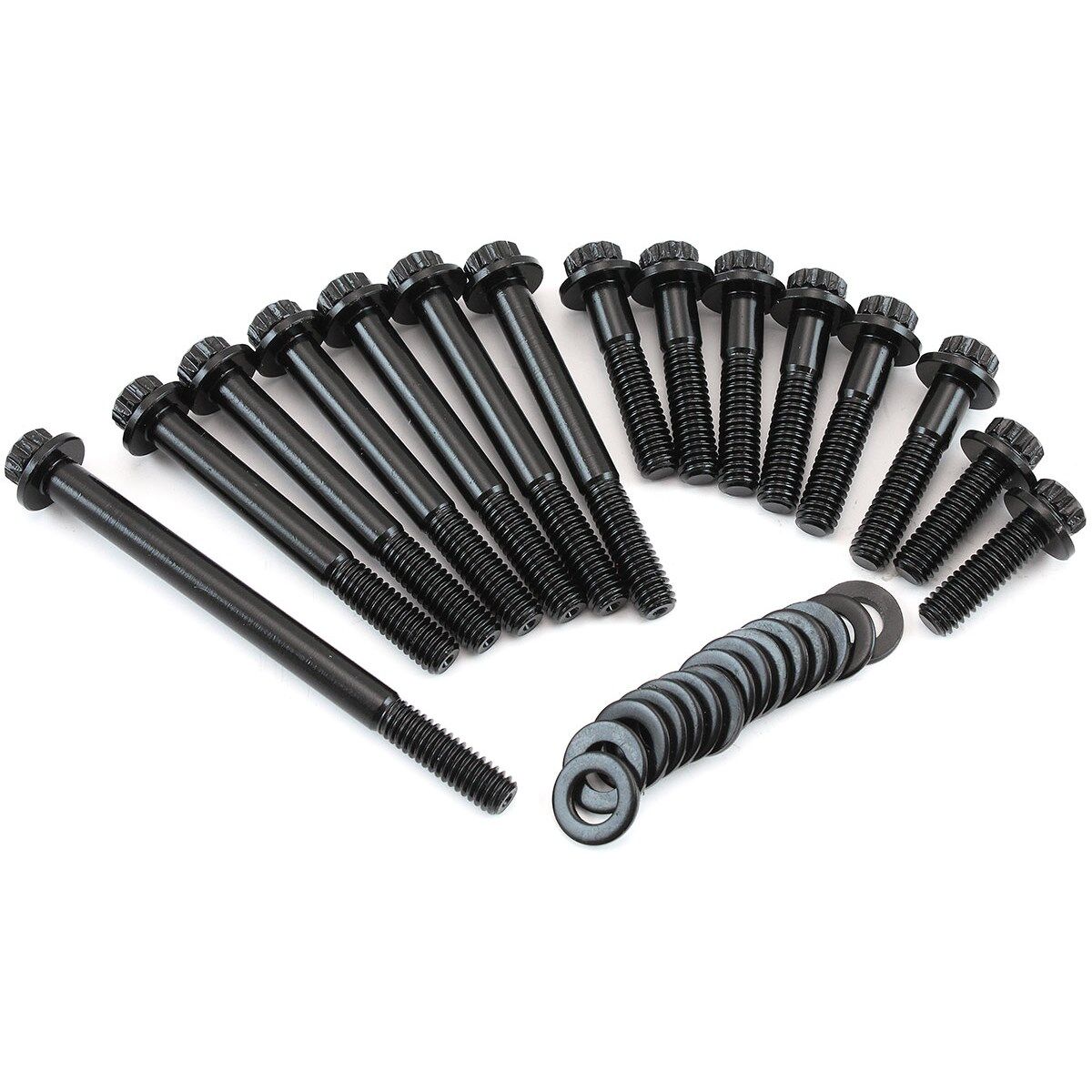 When installing a new timing cover and water pump it is recommended to upgrade your mounting bolts. These Aeroflow timing cover and water pump bolts are made from chrome moly 8740 for strength. They are coated in a black oxide finish for protection and long-lasting durability. Each bolt features a compact 12-point head which is ideal for use where space is minimal on most aftermarket water pumps and timing covers compared to the factory bolts with a larger head. Each set includes thick flat washers for optimum clamping pressures to ensure a sure seal.