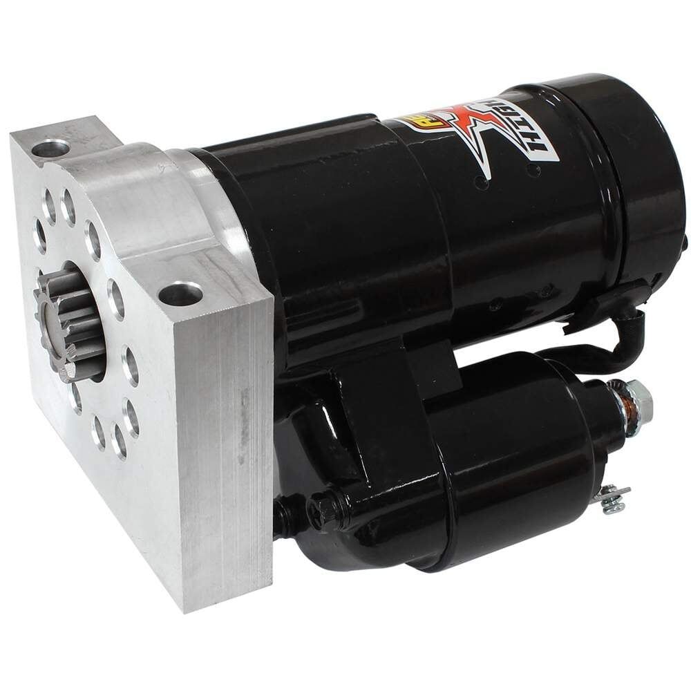 Aeroflow Hitachi style hightorque starter motors are serviceable and manufactured from aluminium with a multi-angle mounting block that allows different mounting positions to clear multiple header and oil pan configurations. The 1.4kw / 1.9hp starter is recommended for engines up to 400cu and 14:1 compression ratio and utilizes a 4.44:1 gear reduction. Aeroflow starter motors have high heat resistance and are powdercoated black for extra corrosion protection.
