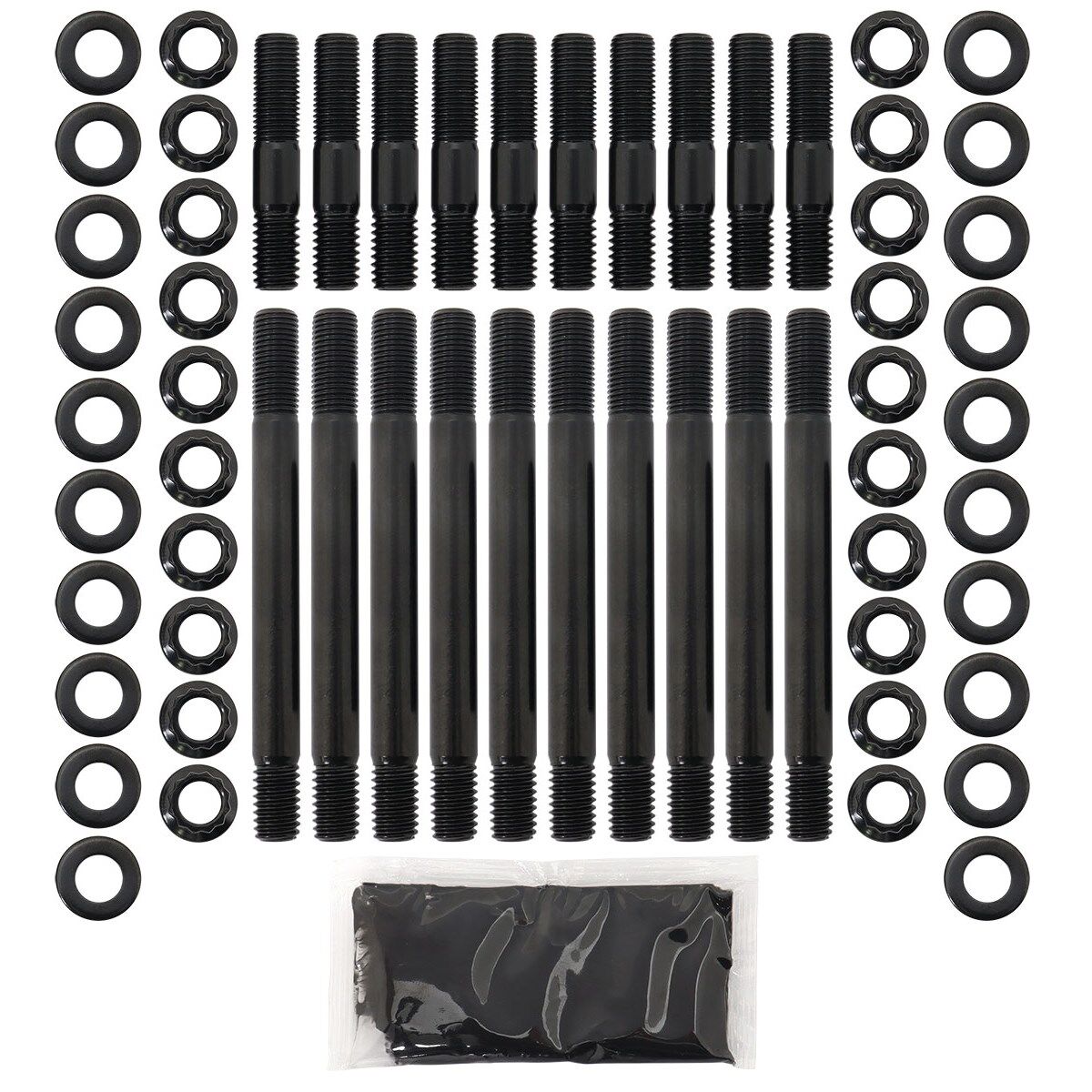 These head studs are manufactured from aircraftquality 8740 high tensile strength chromoly steel and cold-forged to ensure molecular integrity within thestud. Meaning these studs are rated up to 190,000 psi makingthem stronger than Grade 8 andOEM fasteners. All kits come complete with 12-point nuts and hardened washers for an even load distribution and accurate torque readings.