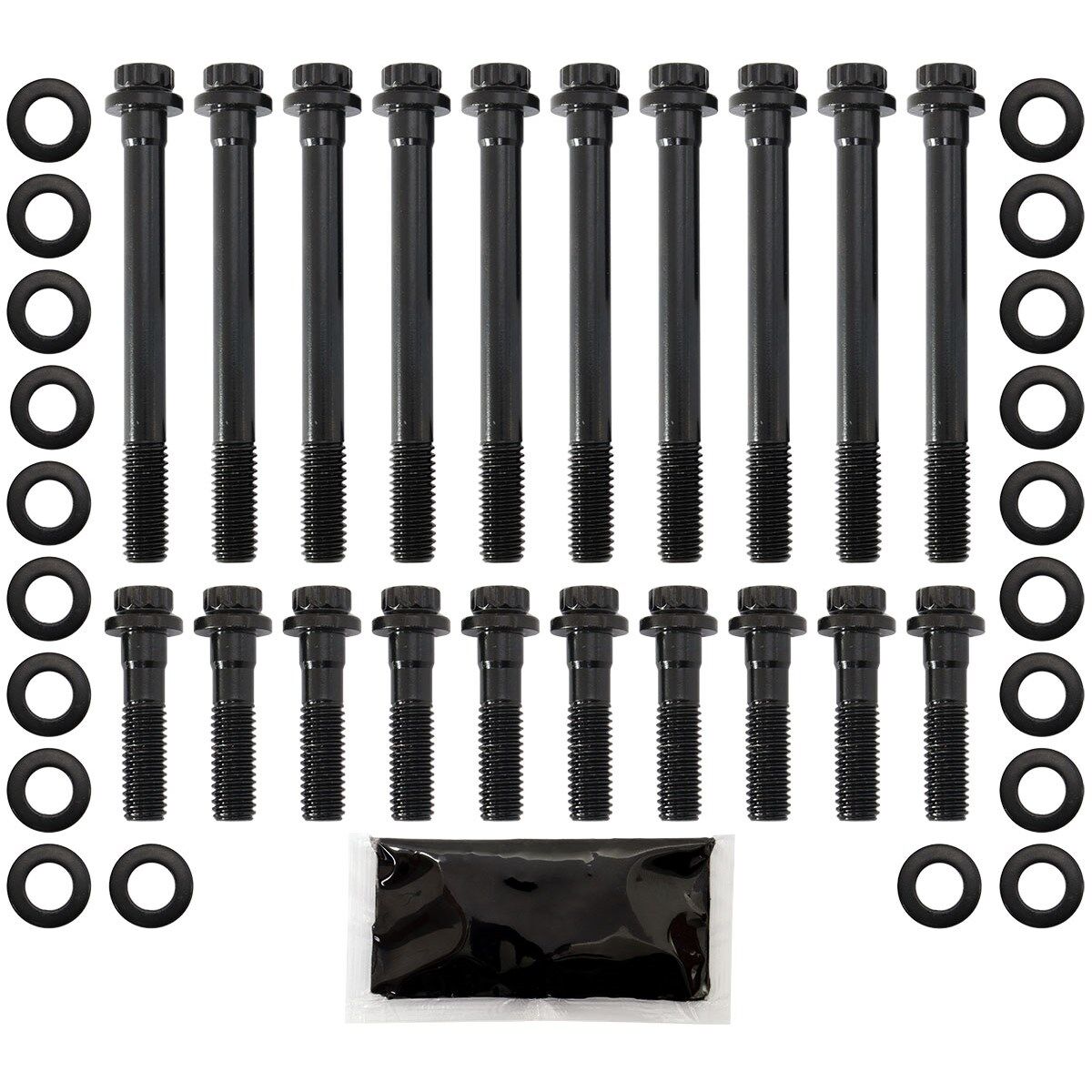 These head bolts are manufactured from aircraft quality 8740 high tensile strength chromolysteel and cold-forged to ensure molecular integrity within the bolt. Meaning thesebolts are rated up to 190,000 psi making them stronger than Grade 8 and OEM fasteners. Allkits come complete with hardened parallel washers for an even load distribution and accurate torque readings.