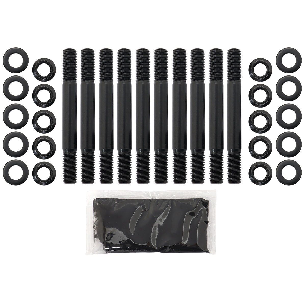 These main studs are manufactured from aircraft quality 8740 high tensile strength chromoly steel and cold-forged to ensure molecular integrity within the stud. Meaning thesestuds are rated up to 190,000 psi making them stronger than Grade 8 and OEM fasteners. Allkits come complete with 12-point nuts and hardened parallel washers for an even load distribution and accuratetorque readings.