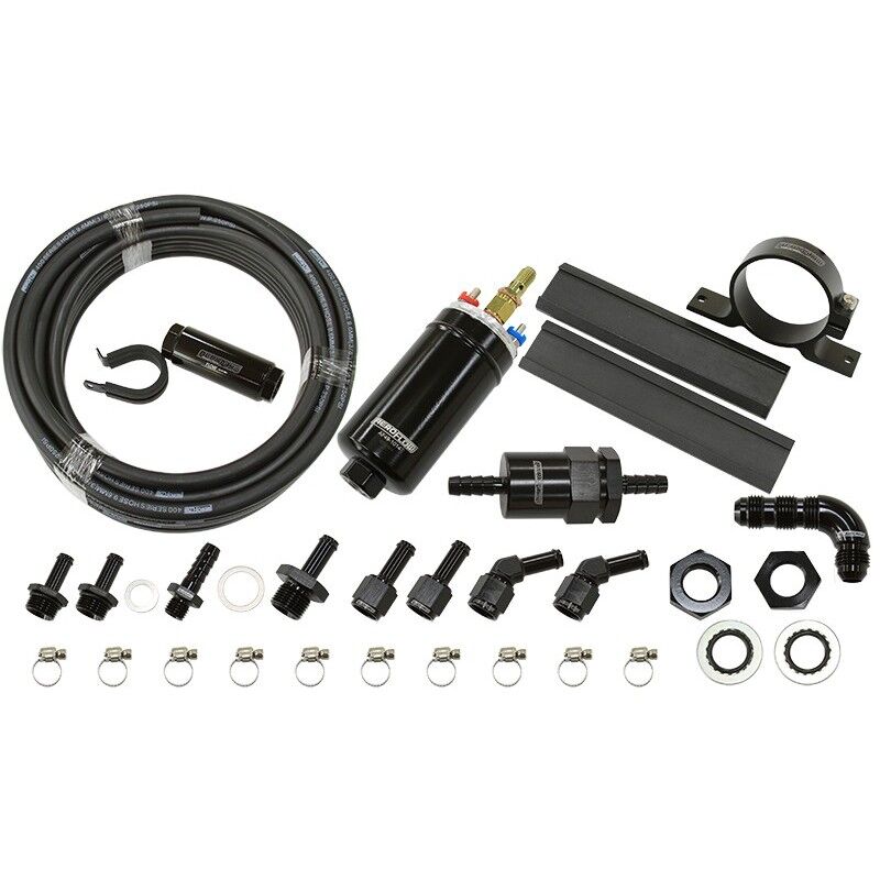 This kit features a high volume 255 L/PH external inline EFI pump that will provide enough fuel delivery for up to 600 HP. Kit also includes fuel lines, fittings and two billet fuel filters and enough premium quality hose for an inlet and return line. The filters include a 100 micron pre-filter and a 30micron post filter. Note that when using this pump a return line to the fuel tank is required.