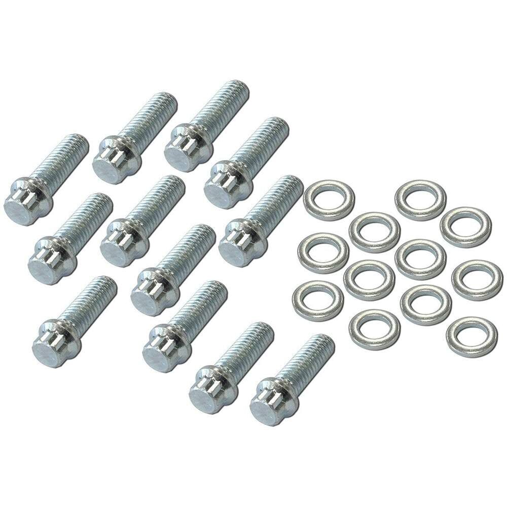 When installing a new intake manifold it is recommended to upgrade your intake bolts, some standard intake manifold wont work depending on aftermarket intake manifolds. These Aeroflow intake bolts are madefrom Grade 8 steel for strength. They are zinc coatedfor protection and long-lasting durability. Each 12-point head is designed to take a 3/8" spanner size.This compact 12-point head is ideal for use where space is minimal on most aftermarket intake manifolds compared to the factory bolts with a larger head. Each set includesspecial extra thick flat washers for optimum clamping pressures to ensure a sure seal.