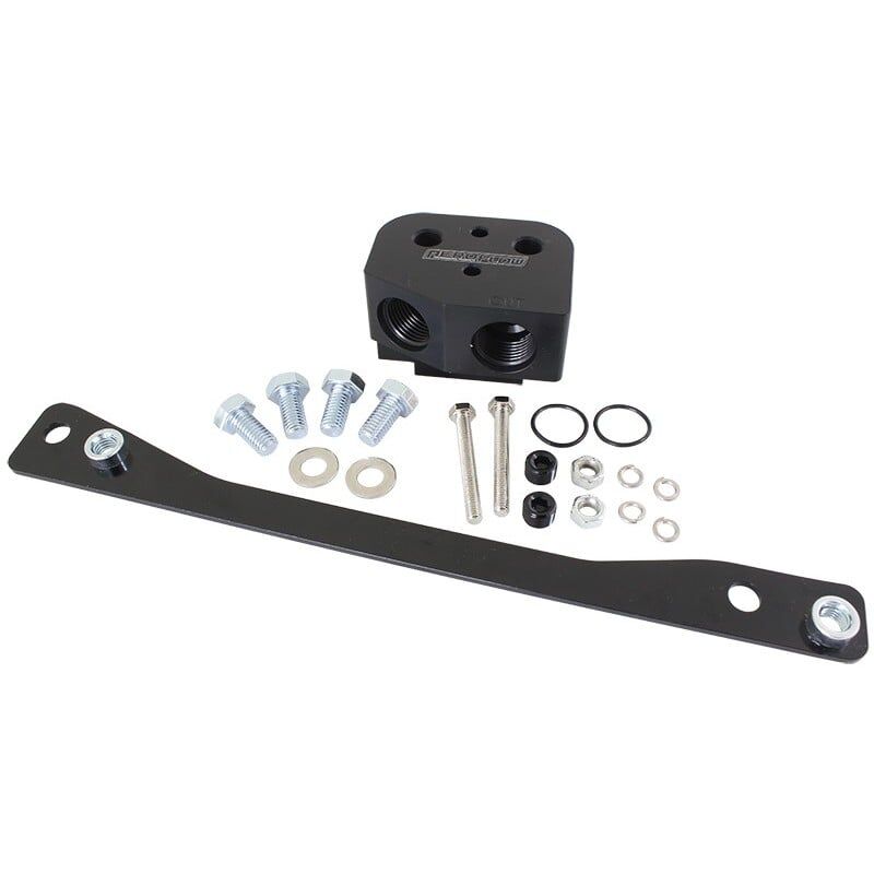 Now you can bolt on oil coolers and redirect your engine oil with these LS oil cooler adapters. AF64-2114BLK is designed to bolt directly in place of the factory bypass cover on front sump LS Chevy engines (VT-VZ Commodore and Pontiac GTO should use extension AF64-2184BLK to clear the engine block) allowing you to run an oil cooler. This adapter features 2x Female -8 ORB ports and 2x 1/8" NPT ports for running temp or pressure gauges or an oil feed line fora turbocharger or supercharger. The main body ismade from billet 6061 aluminium, then anodised blackfor great looks and corrosion resistance. Included with thiskit is a billet bracket designed to help relocate the power steering line into a better location to allow room for this adapter.