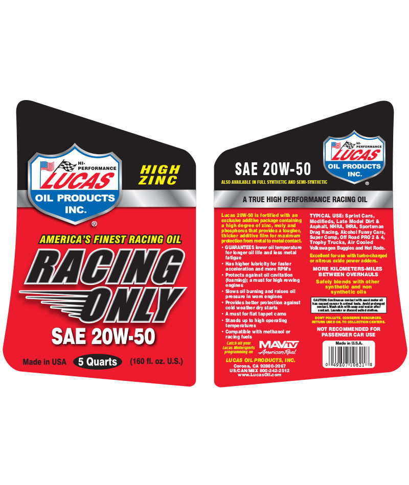 Lucas High Performance Racing Only is a purpose built product designed for the high performance racing industry. It's blended with an exclusive additive package that includes lubricity agents and anti-seize agents that control drag like a zero weight oil and protects metal like a heavy multi-viscosity oil. It is perfect for high RPM & high horsepower Engines. For more specific information on each racing oil please review our product specification sheets.
