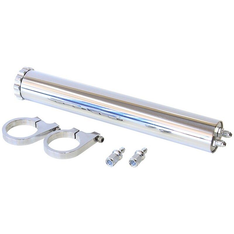 This tank features two -4AN male fittings end of the tank with two -4AN female to 5/16" (7.95mm) barb fittings. Constructed from 6061-T6 aluminium and includes two billet aluminium mounting brackets & hardware.