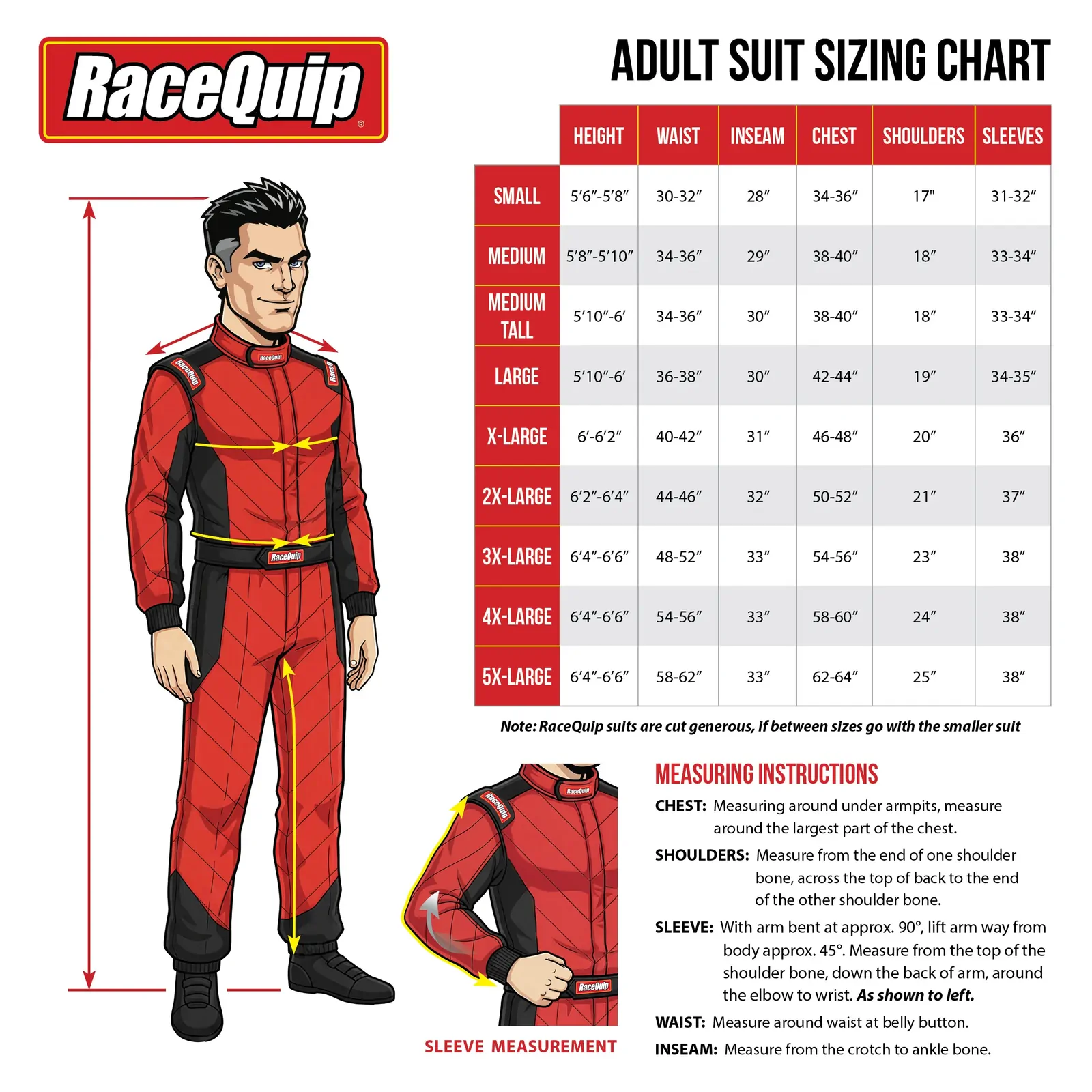 • RaceQuip 120 series suits are stylish. Add to this the pleated back panel for freedom of movement, boot cuffs, deep bag pockets and the adjustable euro-style belt, and you have a multi-layer suit that provides an outstanding value