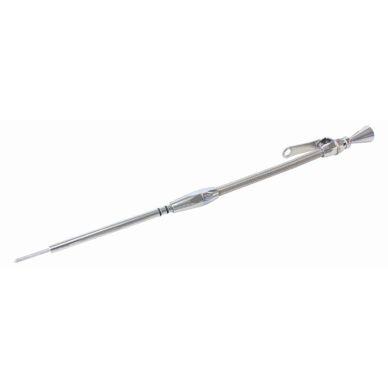 Aeroflow's Flexible engine dipsticks are 308 stainless steel braid covering over a hard-wearing, high quality PTFE liner. The handle and ends are made from 6061-T6 aluminium then hand polished and chrome plated or black anodised. A double o-ring sealkeepds the dipstick secured inthe tube and prevents crankcase gases form escaping.These not only look great but the flexible inner dipstick ismarked to give accurate oil level readings.