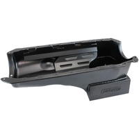 Aeroflow's range of super oil pans available for most popular V8 engines are the perfect choice for street or track driven high performance engines. These pans start out as new stamped steel pans which are customized with specially designed extra oil capacity wings. These wings allow extra oil capacity without affecting ground clearance which helps maintain more constant oil temperatures for reliability and feature windage trays and crank scrapers. Available in black finish. Pans have 6.5 Liter (6.86 US Quarts) capacity.