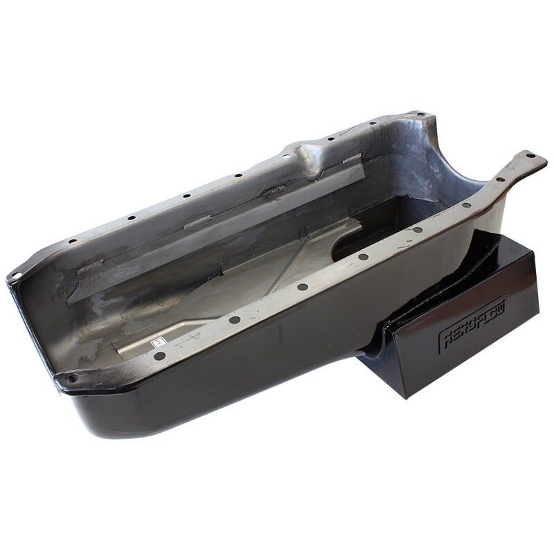 Aeroflow's range of super oil pans available for most popular V8 engines are the perfect choice for street or track driven high performance engines. These pans start out as new stamped steel pans which are customised with specially designed extra oil capacity wings. These wings allow extra oil capacity without affecting ground clearance which helps maintainmore constant oil temperaturesfor reliability and feature windage trays and crank scrapers. Available in black finish. Pans have 6.5 Litre (6.86 US Quarts) capacity.
