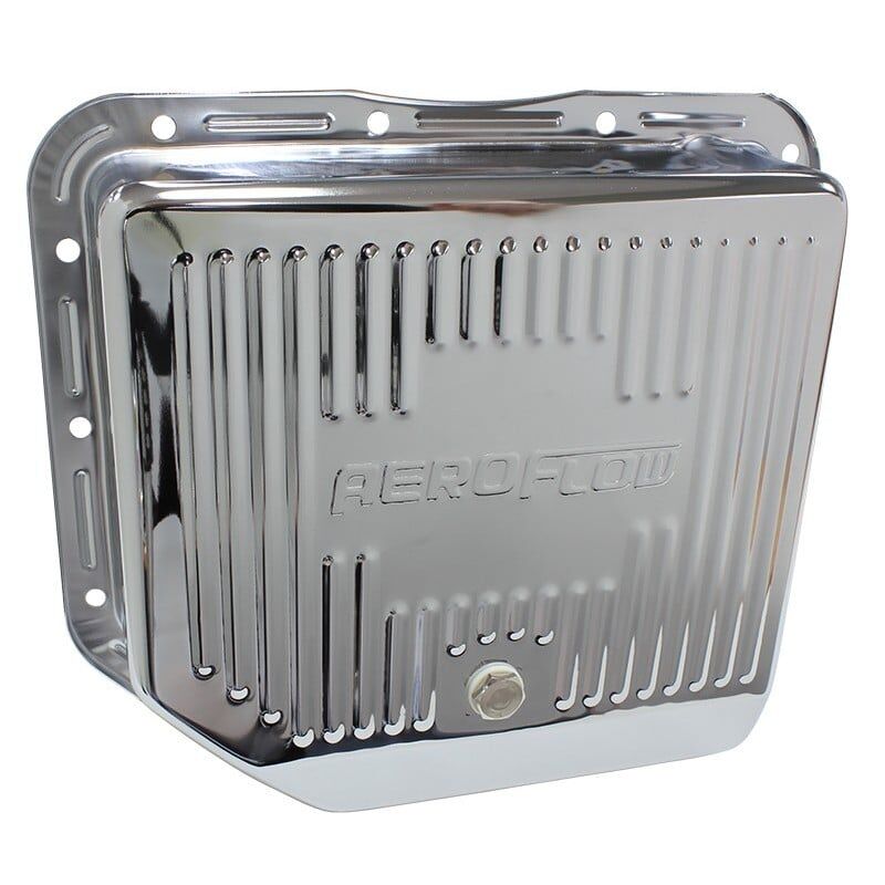 These Aeroflow transmissionpans add a little zing to the undercarriage of any vehicle. The included drain plug makes transmission service a snap. These pans are thicker than stock so you don’t have to worry about leaky pan rails. Available in two great finishes; chrome plated and black electrolysis.