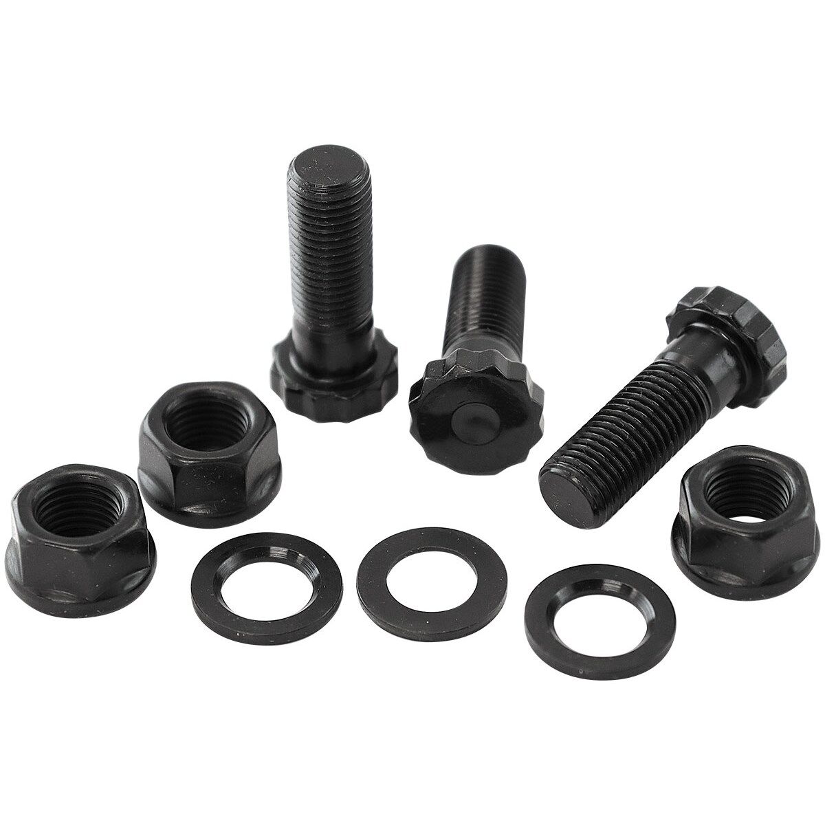 These bolts and nuts are manufactured from aircraft quality 8740 high tensile strength chromoly steel and cold-forged to ensure molecular integrity within the stud. Meaning these are rated up to 190,000 psi making them stronger than Grade 8 and OEM fasteners. All bolts feature a 12-point head and hardened washers for an even load distribution and accurate torque readings.