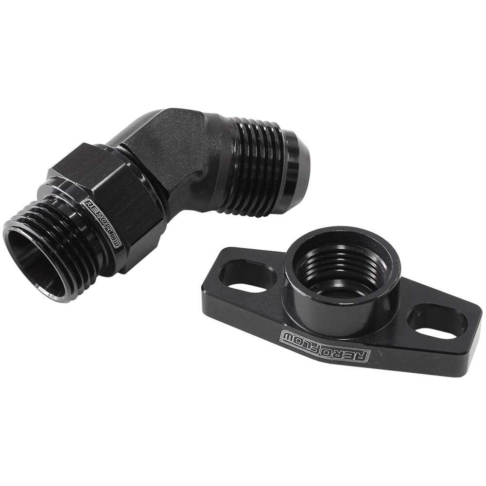 This selection of turbo drains options available from Aeroflow Performance will allow a large range custom plumbing application. For sufficient drainage of oil forboth bearing styles of turbochargers a -10AN or 5/8” hose is ideal. The oil outlet should follow the direction of gravity +/-45° when installed in the vehicle on level ground. It is recommended to avoid kinks or beyond 90-degree bends in the oil drain line and draining into the sump below. With heat surrounding the manifold and turbocharger a heat shield or sleeve is a great idea to prolong the lifeof the hose.