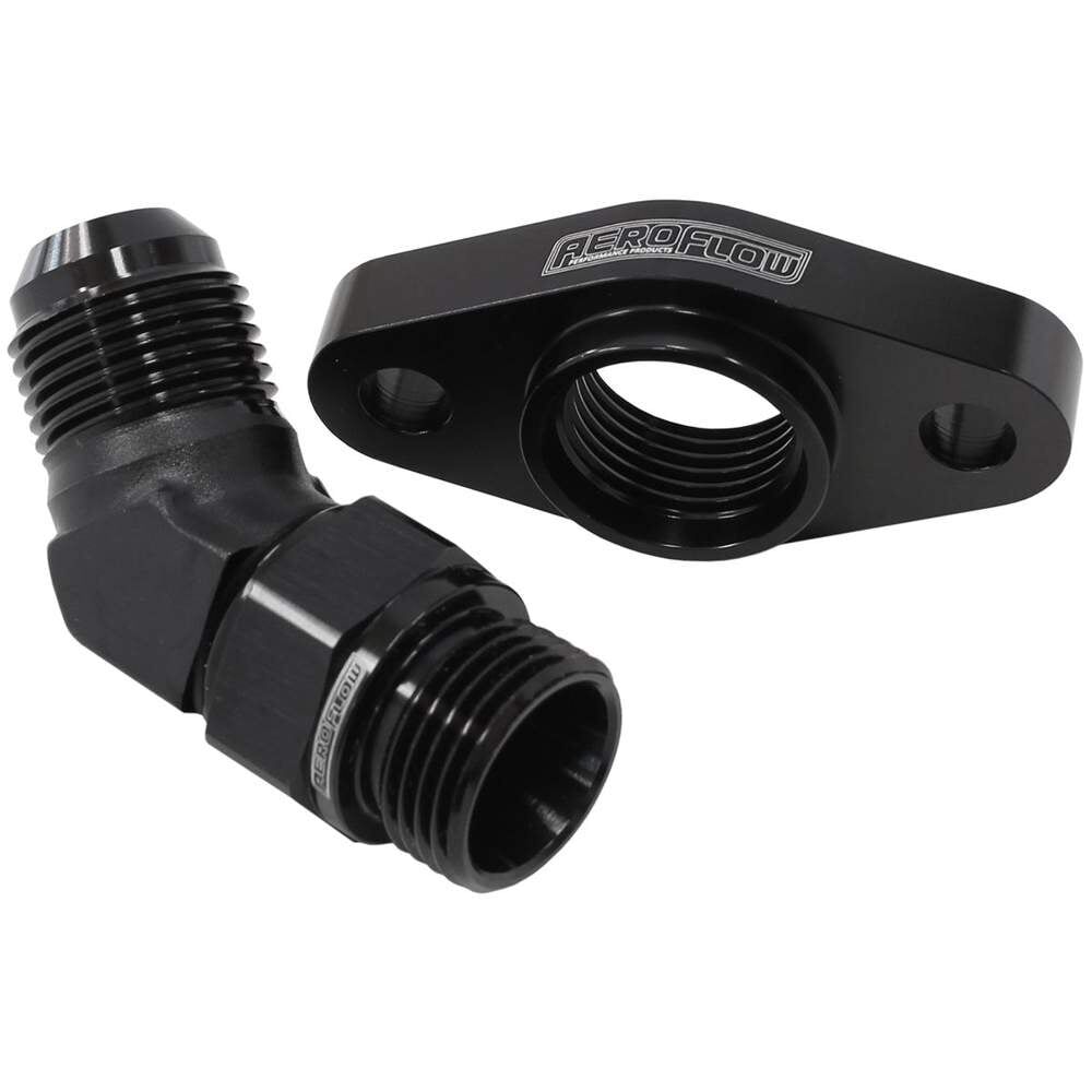 -10 AN with Male 45 degree swivel and 50.8mm hole centresto suit turbos with 50.8mm bolt centres on core.